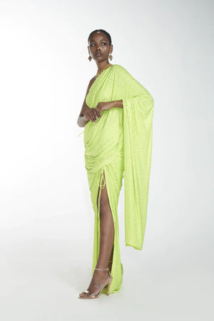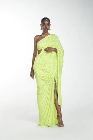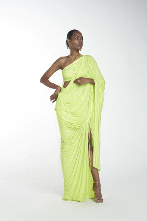 • Neon green slit saree in jersey with detachable palla and adjustable ruched string paired with jersey one shoulder blouse. All embellished in crystal.