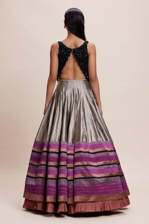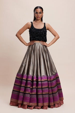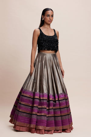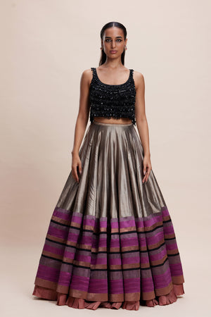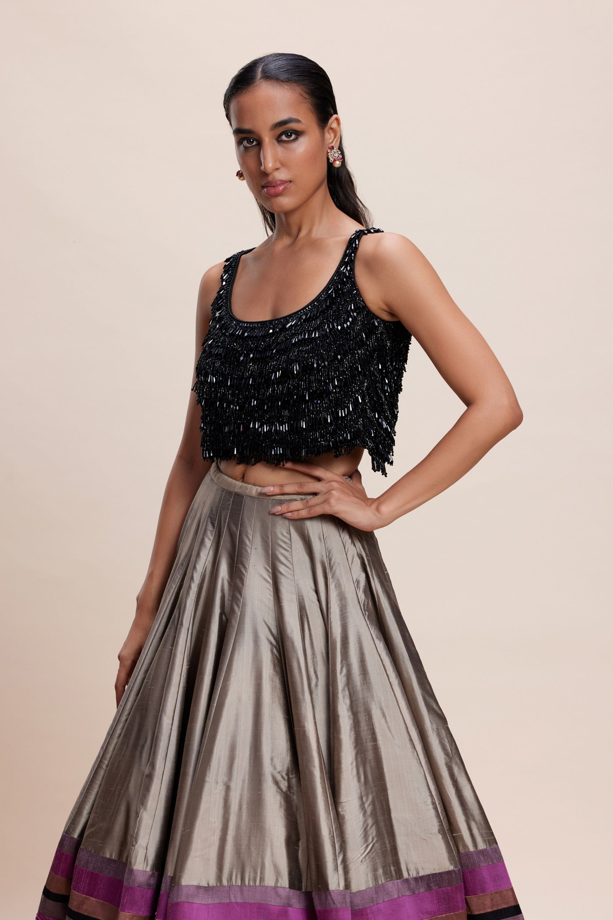 • Discover modern elegance with our black blouse, enhanced by crystalized tassels, paired with a skirt boasting a stunning multi-colored pin-tuck border