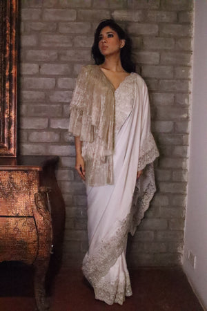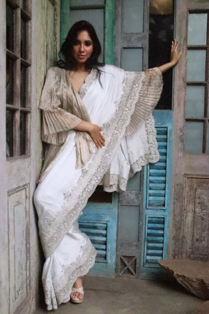 • Damask heavy embroidered light grey habutai saree with blouse piece