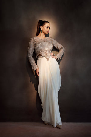 • Champagne Gold Zari Corset Blouse With Taseel Details Wiuth Ivory Drape Skirt