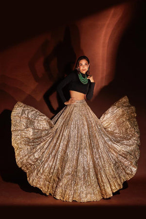 • Woven zari gherdar crinkled lehenga with velvet full sleeves blouse.