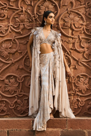• Silver grey skirt set with an organza cape and blouse. Cape is with silver grey embroidery and 3d flowers.