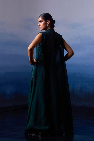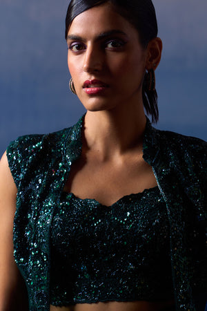 • A forest green jacket set embroidered with tonal sequins, crystals and bugle beads paired with a blouse and sharara.