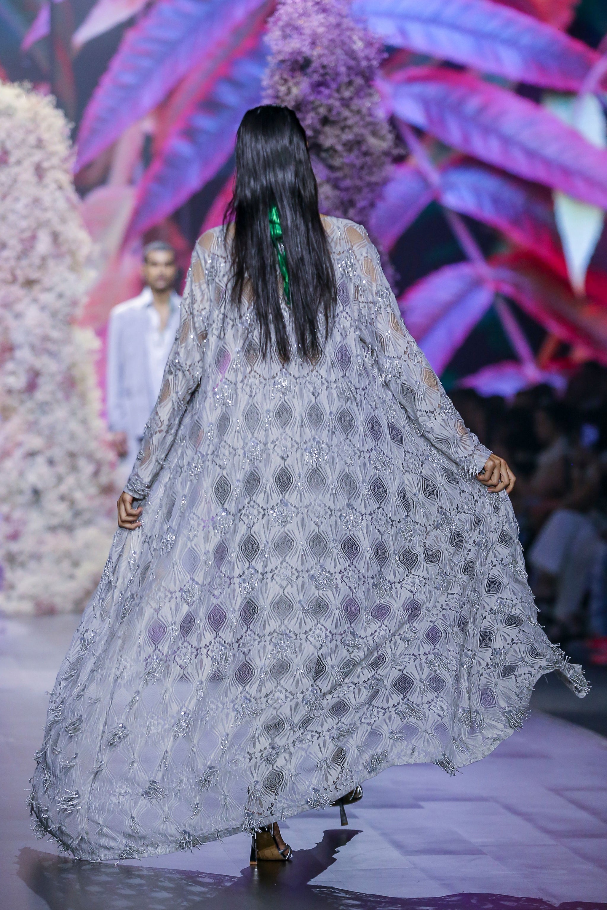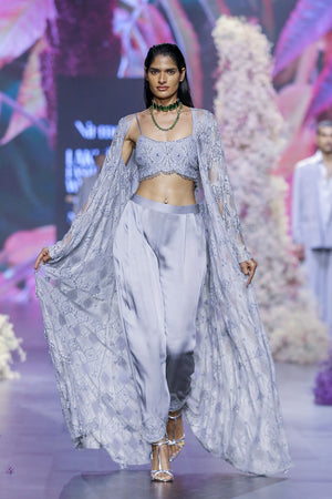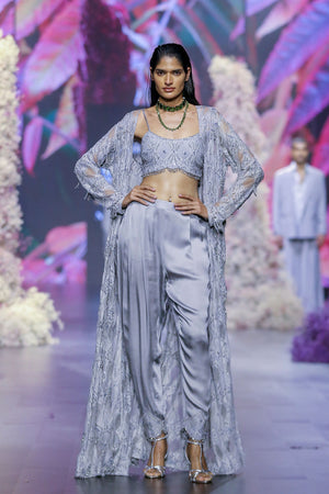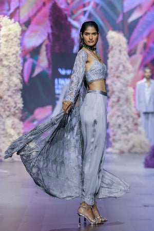 • Glass grey embroidered blouse with modal satin with chantilly detailing pants & embroidered shrug