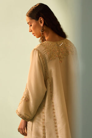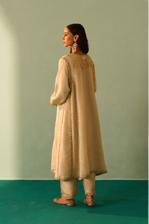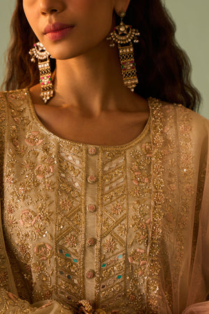 • A gold choga paired with gold salwar and peach dupatta embroidered with silken threads with traditional zardozi using dabka, sequins and cutdana.
