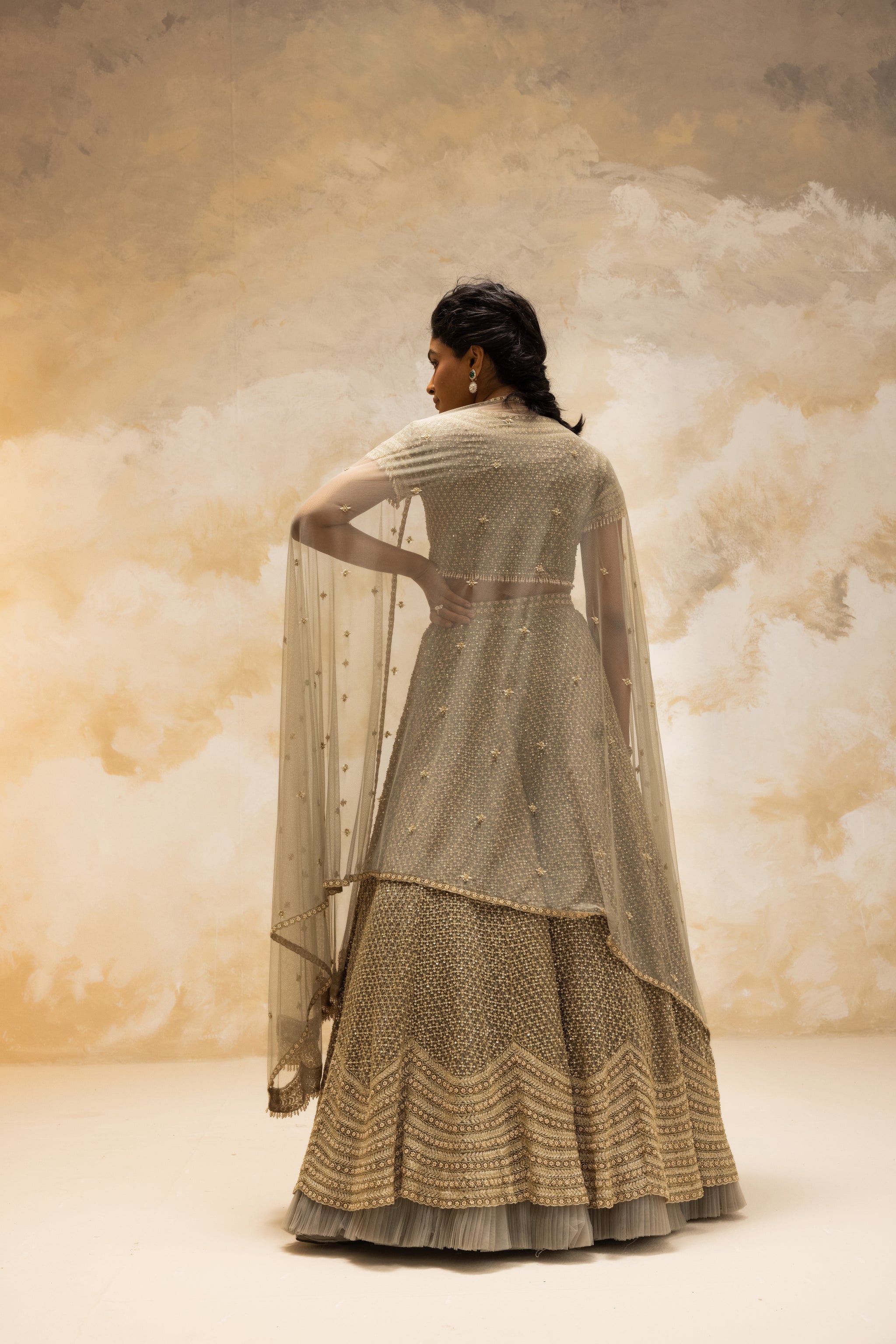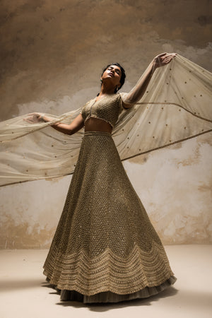 • Golden sequins and bugle beads combined together to form a beautiful geometric checkered texture on lehenga, paired with front open blouse and net dupatta
