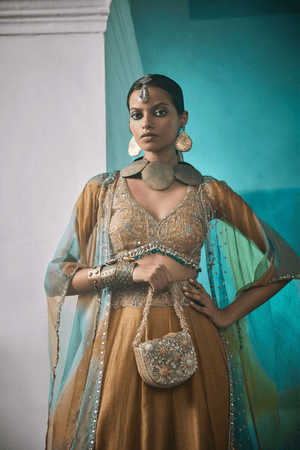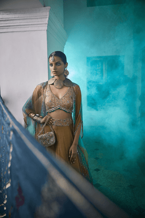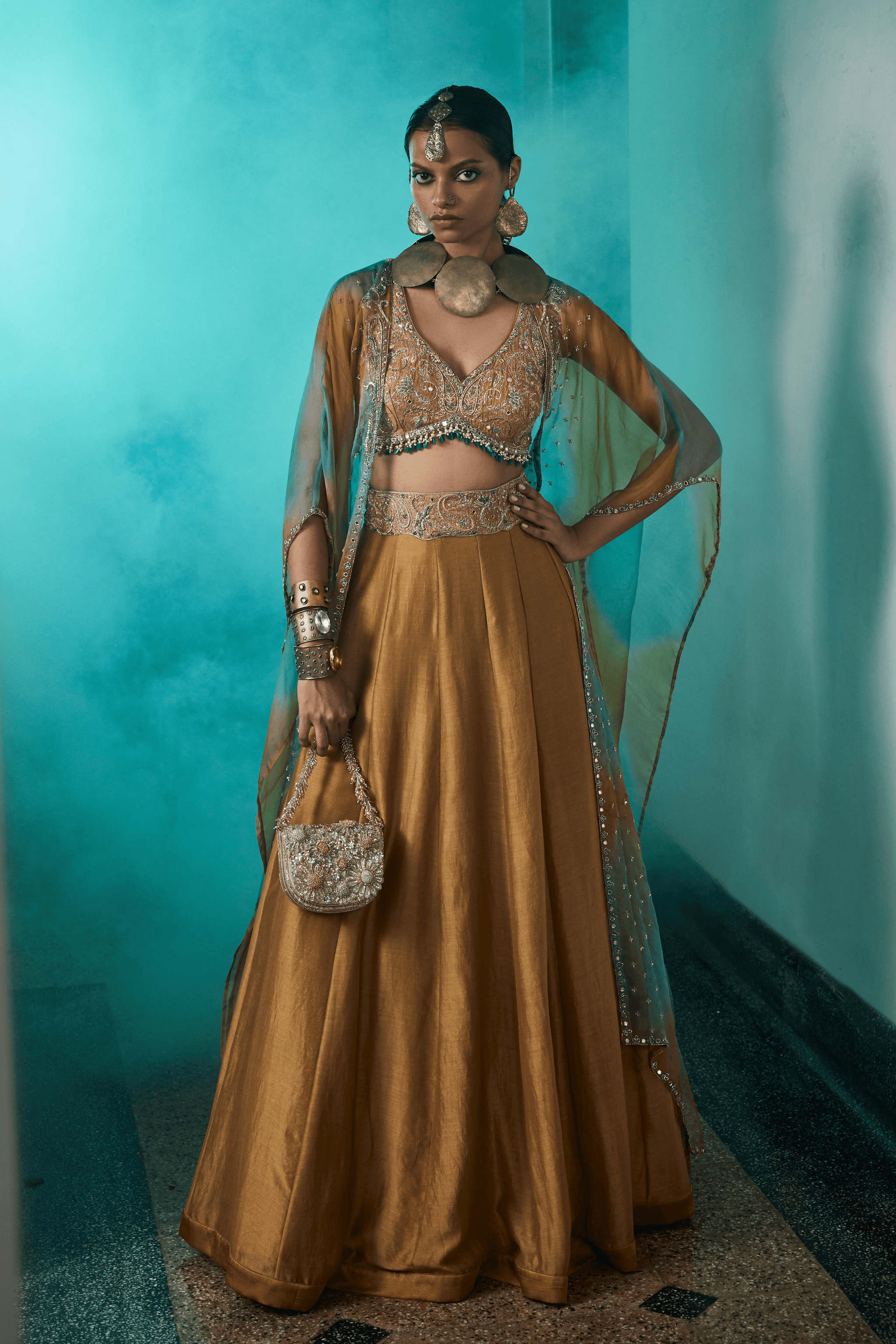 • Fabric: Cape – Organza, Blouse – Raw Silk, Skirt – Chanderi