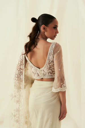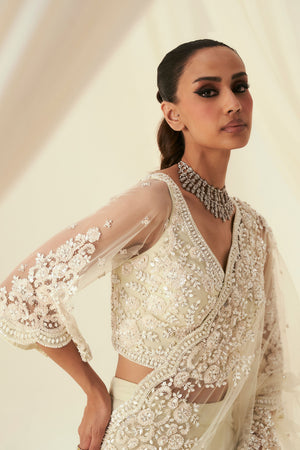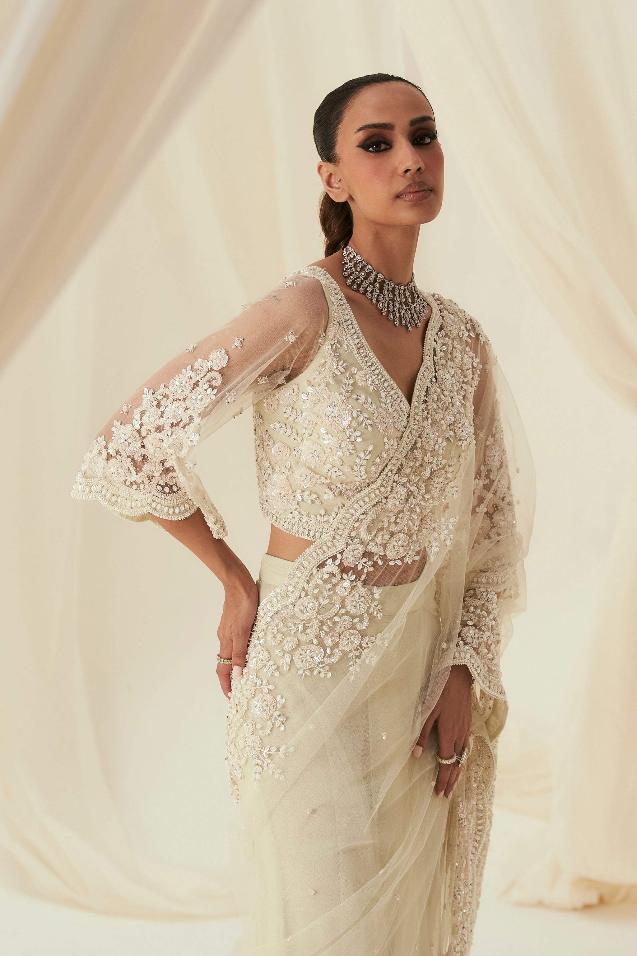 • Pre draped saree crafted in butterfly net and decorated with intricate embroidery embellished with intricate sequins,pearls and cutdana