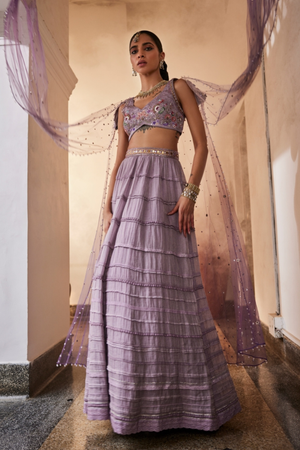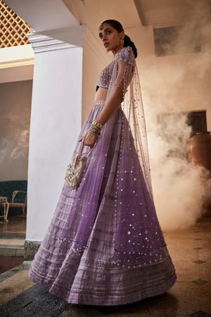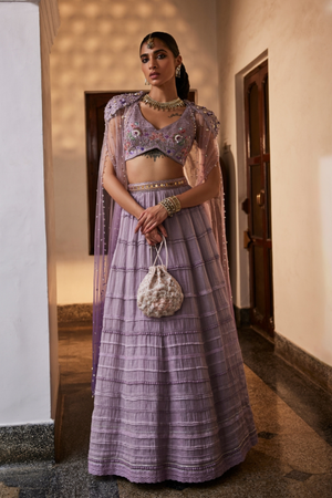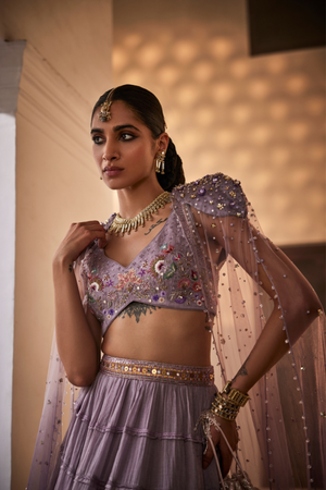 • Fabric: Cape – Tulle Modal Satin, Skirt – Chanderi Silk Tissue, Blouse – Linen Satin