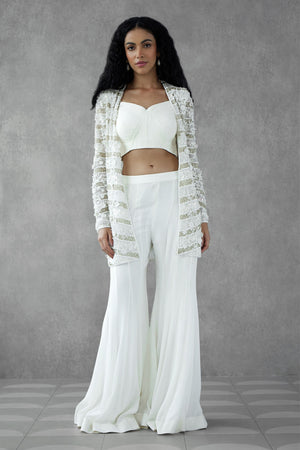 • Wings of a dove : ivory embroidered jacket with pleated bustier and pants