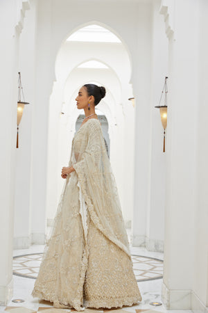 • Ivory net lehenga choli dupatta set embroidered with dori overlaid with tonal beadwork, sequins and crystals