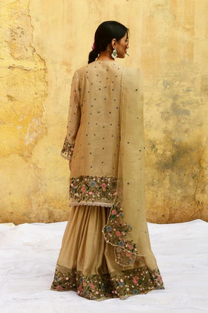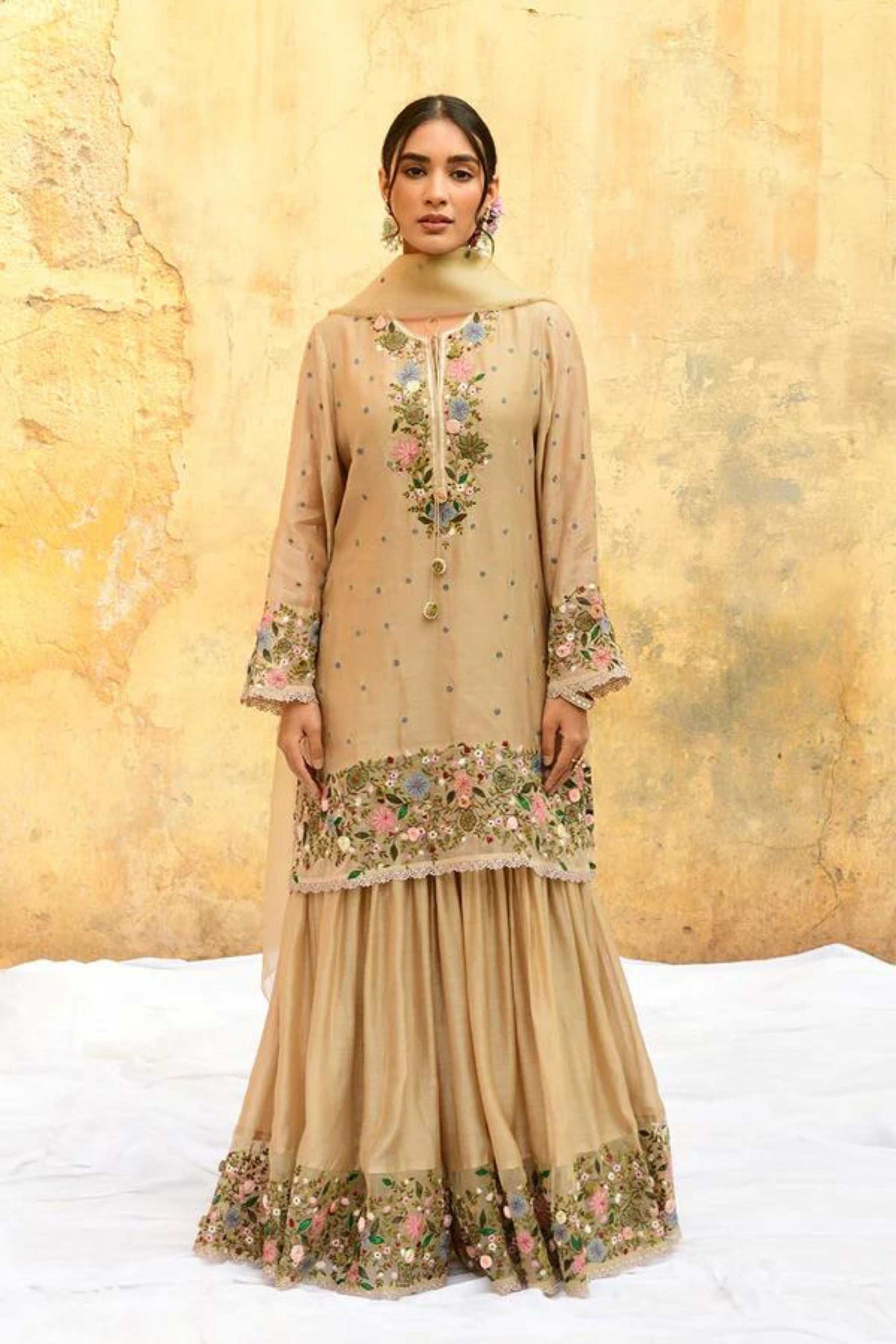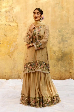 • This dreamy 3 pc sharara set is embroidered with floral applique motifs and resham, highlighted with handmade 3d rosettes in organza. The embroidered organza dupatta comes with scalloped edges and butties sprinkled all over. The kurta and sharara is adorned with a crochet rosette lace. An ideal ensemble for your upcoming summer soirees!