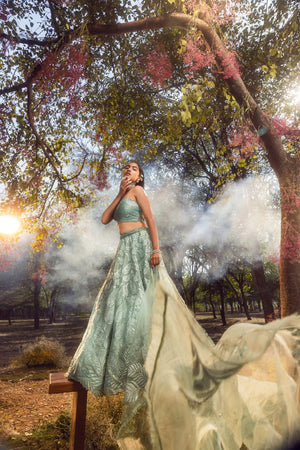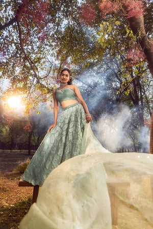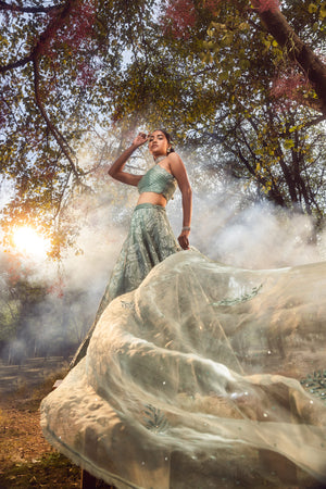 • Jade green organza lehenga choli and dupatta embroidered with satin applique highlighted with beads, sequins and crystals