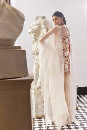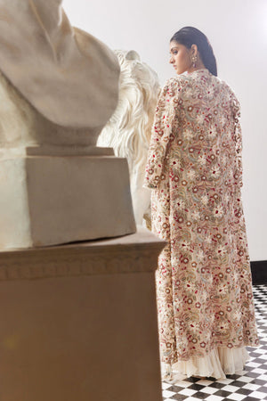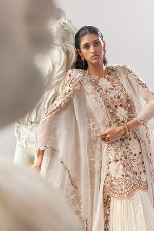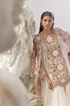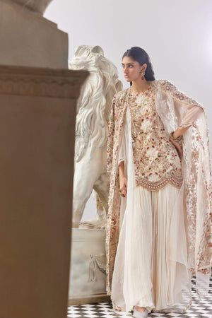 • Each Intricate Petal and Blossom is Masterfully Crafted, Bringing the Floral Motifs to Life in Three-Dimensional Splendor. The Kurta is Adorned with a Delicate Scalloped Border on the Hem, adding a Touch of Graceful Sophistication. Paired with a Chiffon Gathered Sharara, the Ensemble flows with Effortless Charm. WORK: Hand Work and Machine Work