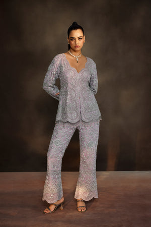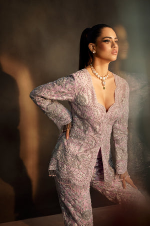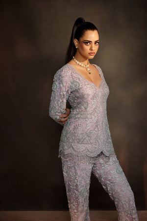 • English Lavender Heavy Embroidered Jacket & Pants With Silver Zari and Bead Work