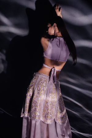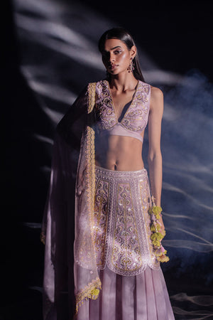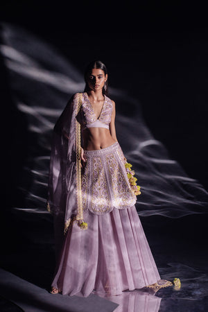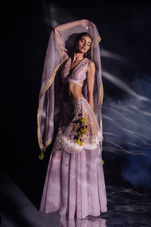 • Dupion silk blouse with back tie up detailing hand embroidered in gota and beads, paired with butterfly net skirt layered with heavily embroidered kalis and silk organza dupatta embroidered with gotta, sequins, finished with cutwork and our signature tassel detailings.