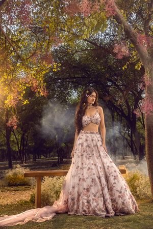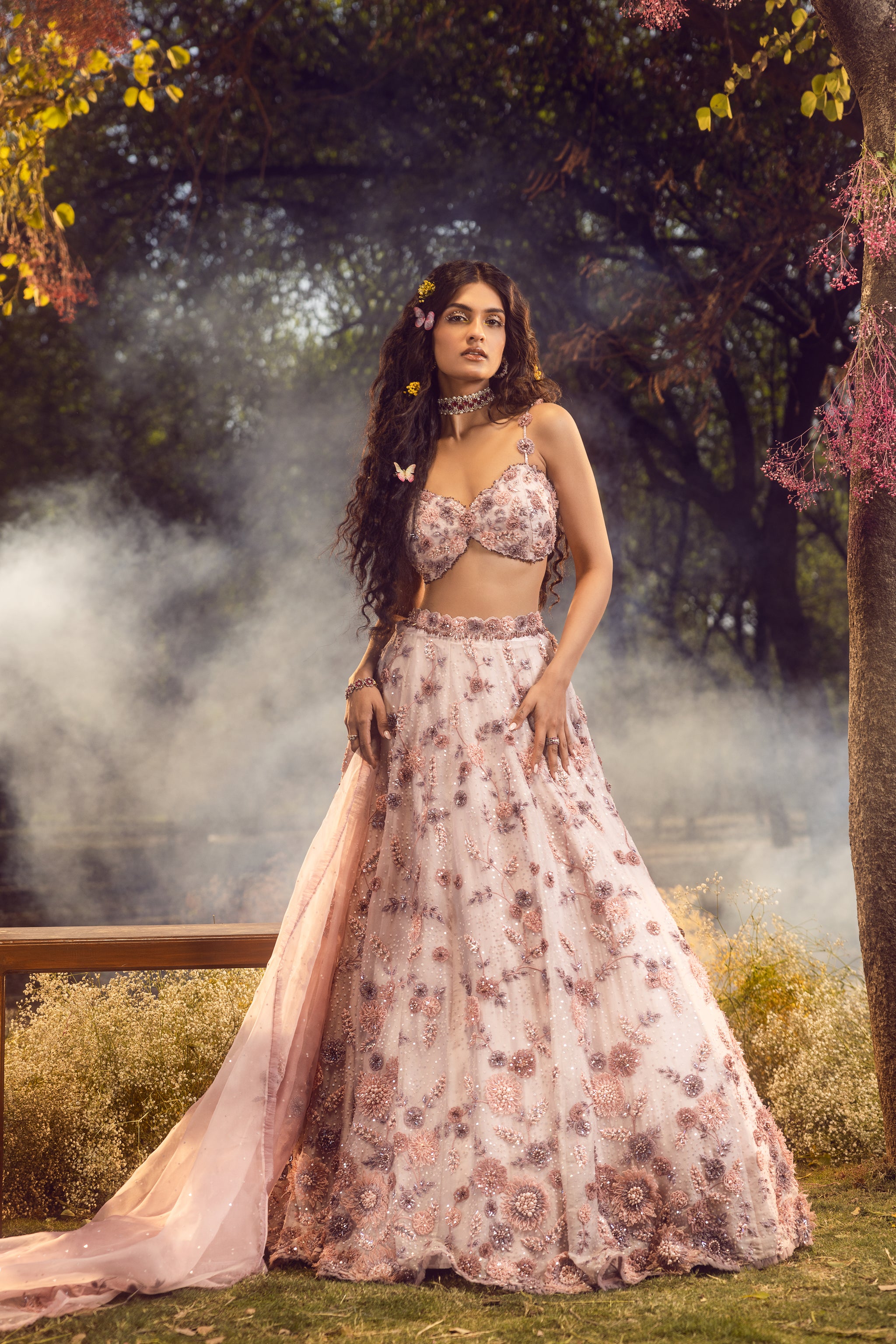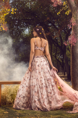 • Lilac organza lehenga choli and dupatta intriately embroidered with 3-d floral jaal highlighted with beads, sequins and crystals