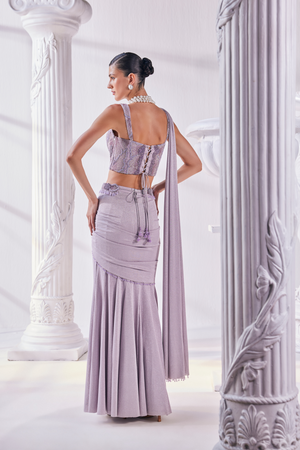• A lilac drape saree crafted from luxurious shimmer lycra. This opulent ensemble boasts an embroidered corset and belt. Effortlessly elegant and irresistibly chic, this saree is perfect for making a statement at any special occasion.