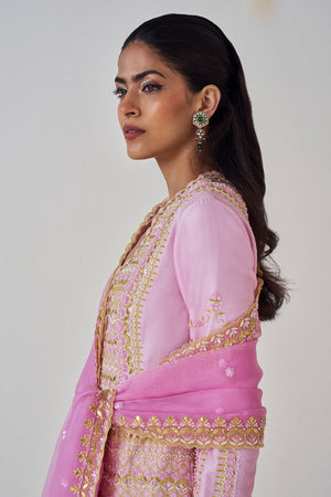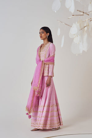 • A short jacket style top paired with a dramatic pair of sharara is our take on this traditional outfit. Gota, thread, and sequins work create intricate patterns.The silk organza dupatta in a deeper lilac shade flaunts a beautiful border with loads of tassel detailing.