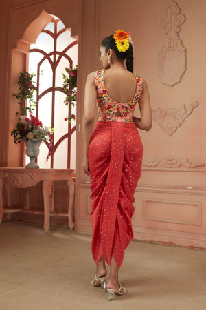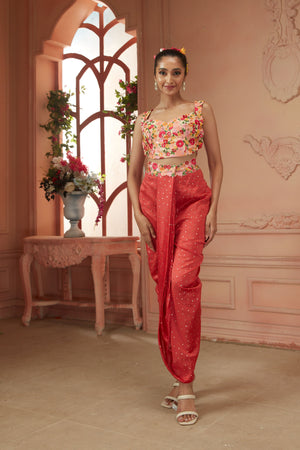• dhoti style drape trousers paired with bustier with floral embroidered resham thread paired with cape