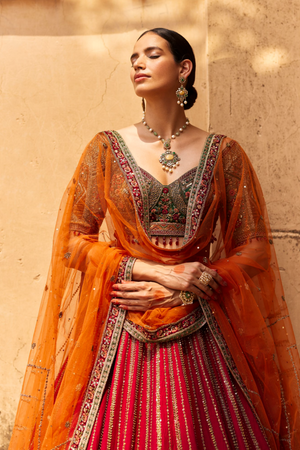 • The artful interplay of kasab dori, dabka, nakshi, and resham embroideries graces the Regal Mariyam Lehenga based on raw silk, creating a tapestry of heritage. The skirt embraces the essence of tradition, elegantly paired with a rustic orange net dupatta. The neckline, echoing ROQA's regal aesthetic, gleams with opulence. Exquisite teardrop tassels line the silhouette edges, adding a touch of intrigue and allure to this exceptional creation.
