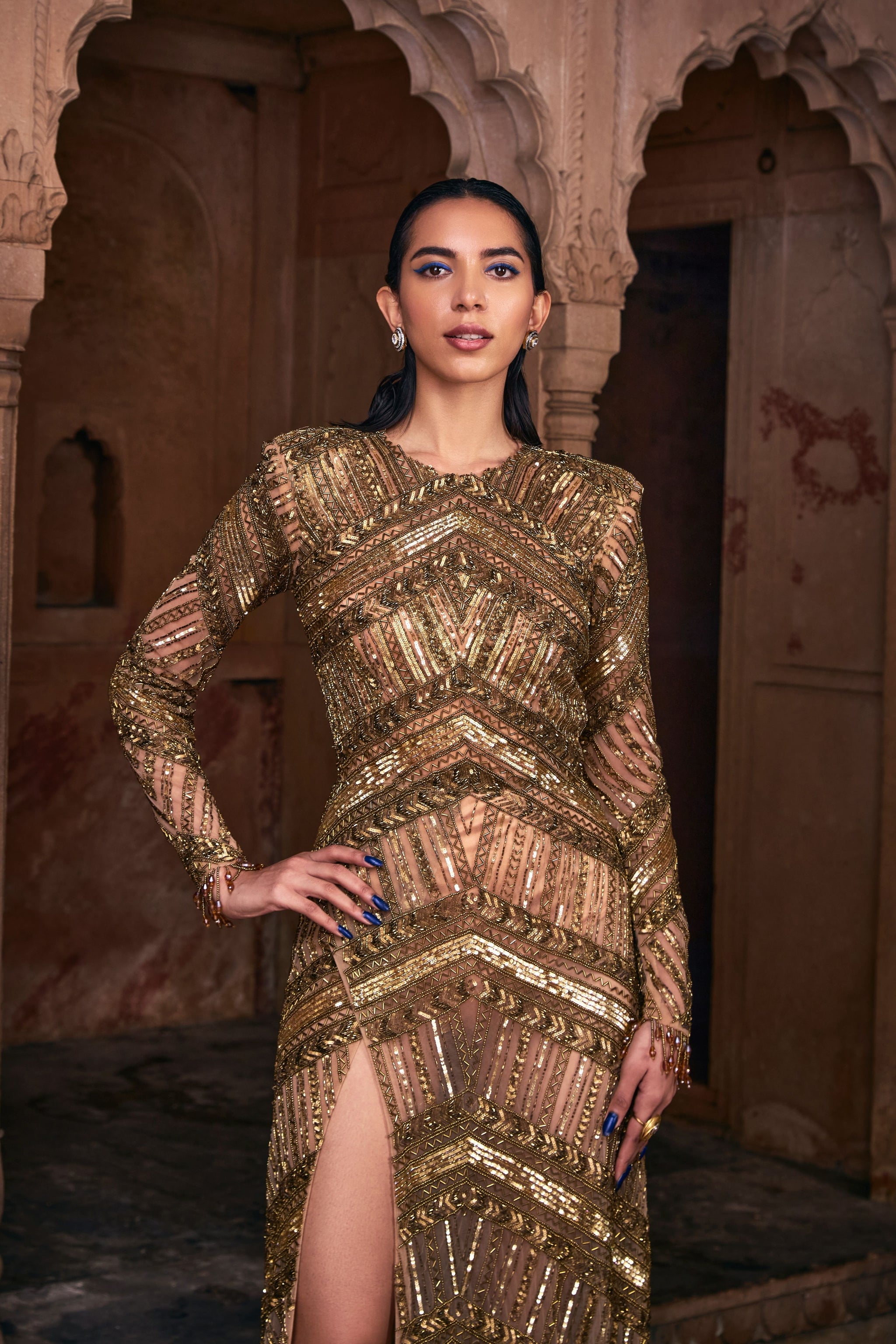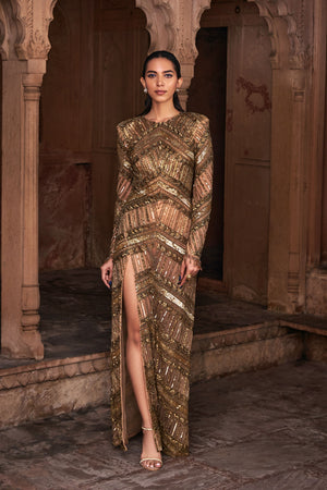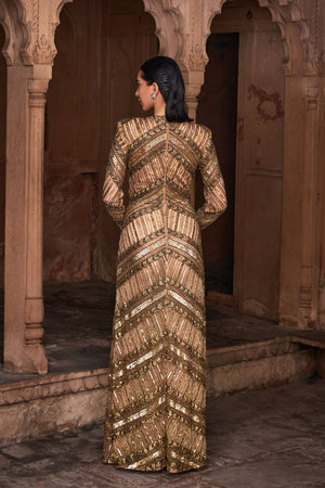 • Matellic gold chevron embroidered jewel neck front slit open gown
