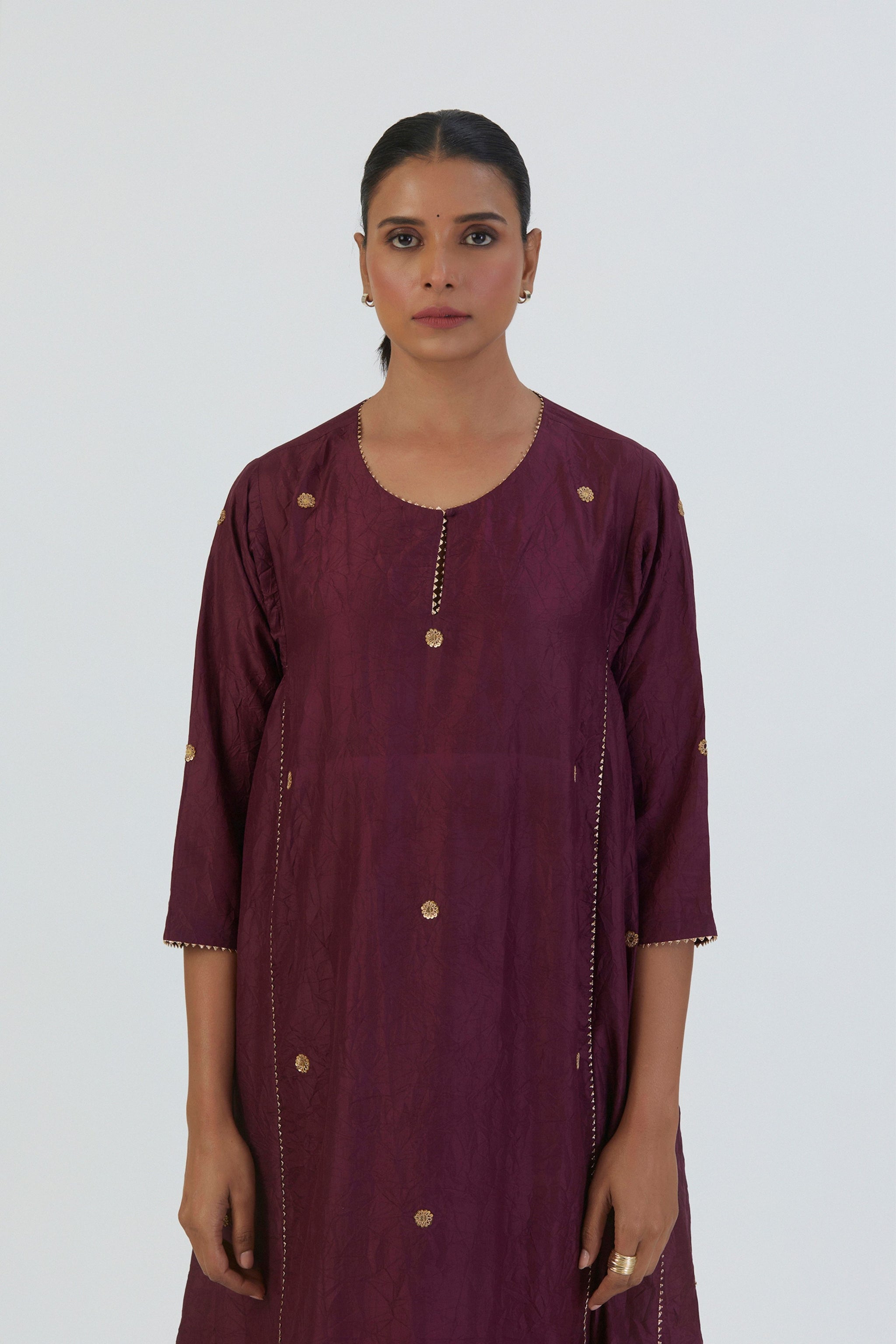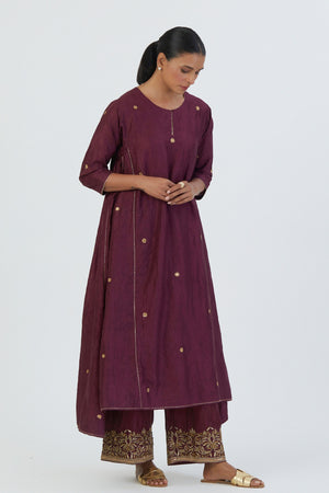 • Meer kurta and pnat crafted in fine silk.The kurta has round butti scattered all over. The silk pant is wide-legged with zardosi embroidered detailing at the bottom. This set includes kurta and pant.