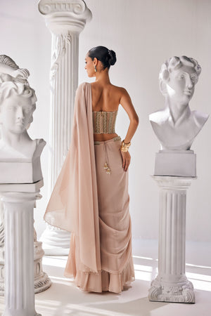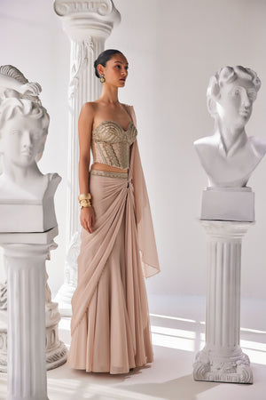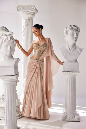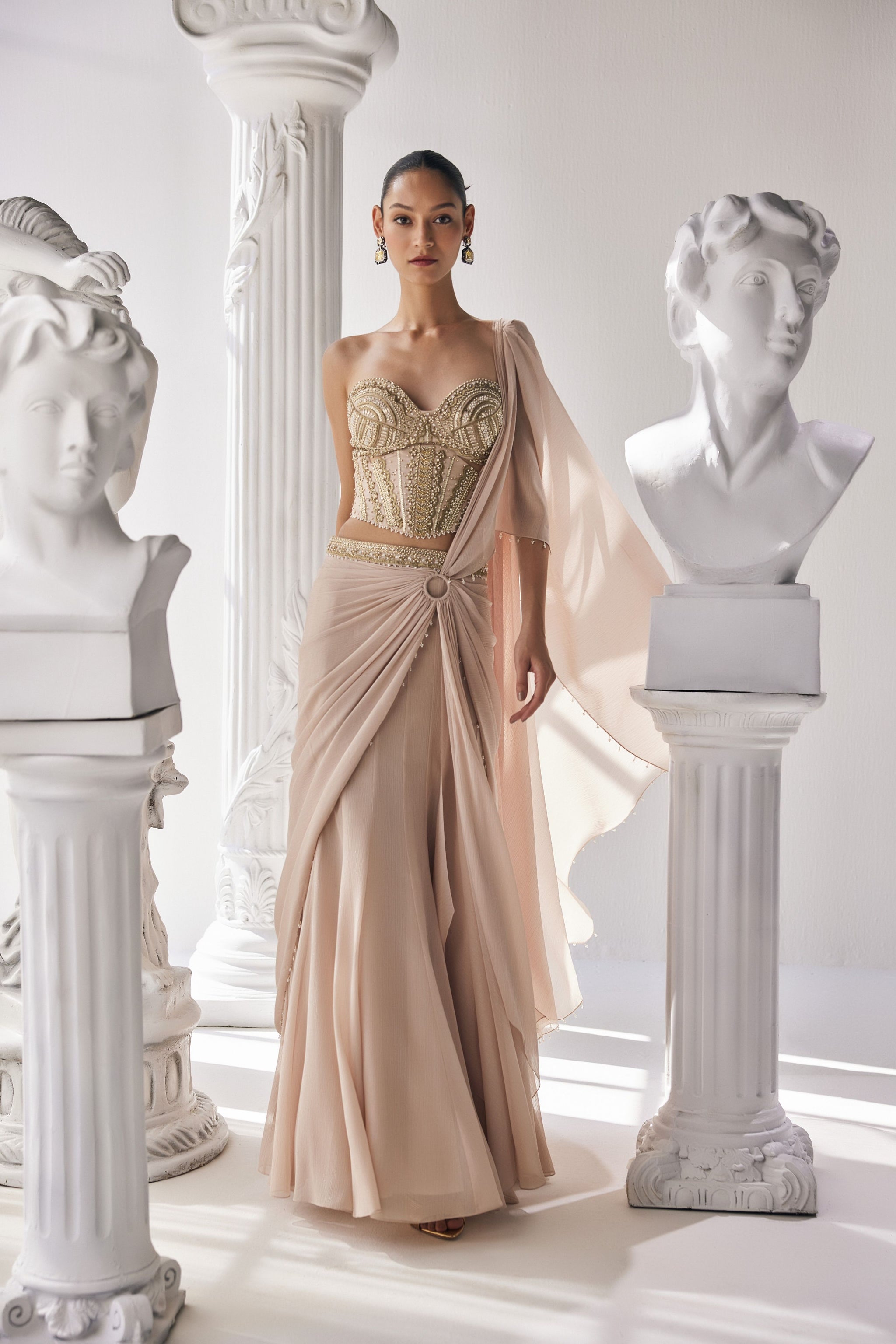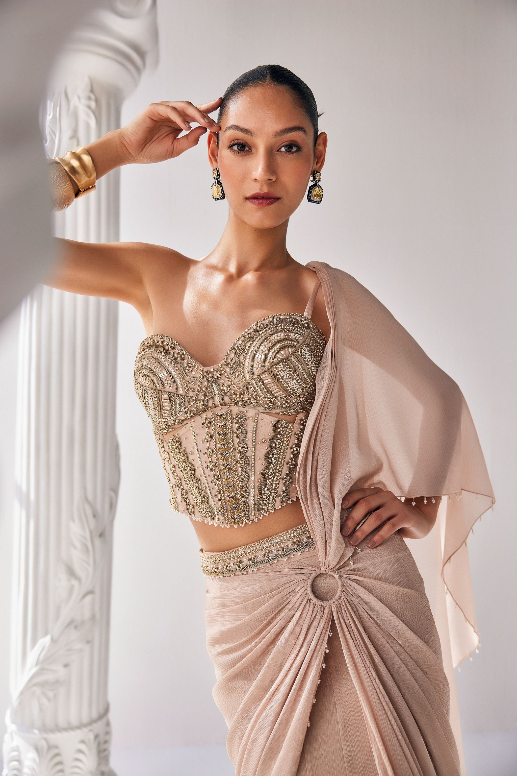 • Draped saree crafted from metallic shimmer chiffon fabric. Adorned with intricate embroidery details, the corset enhances the elegance of this ensemble, while an embroidered belt adds a touch of opulence.