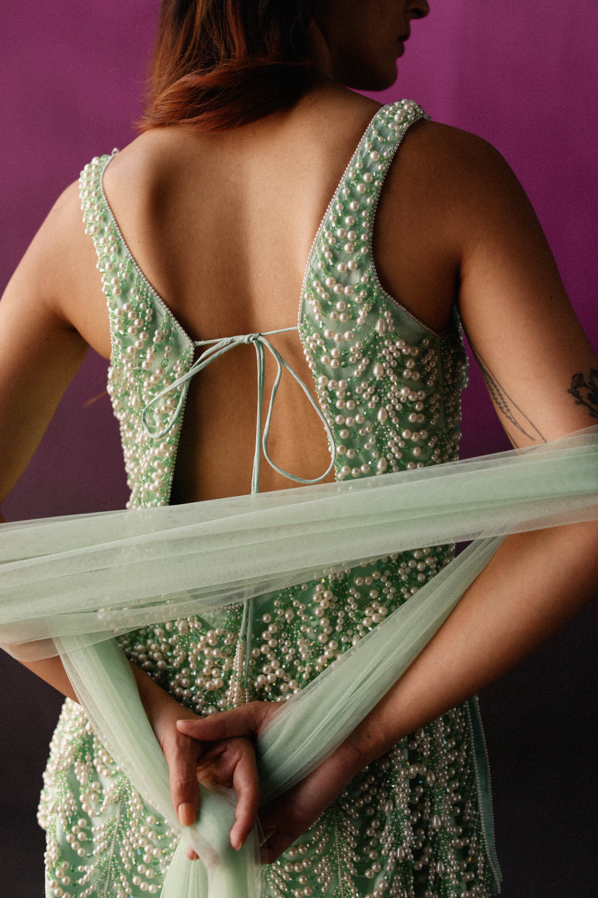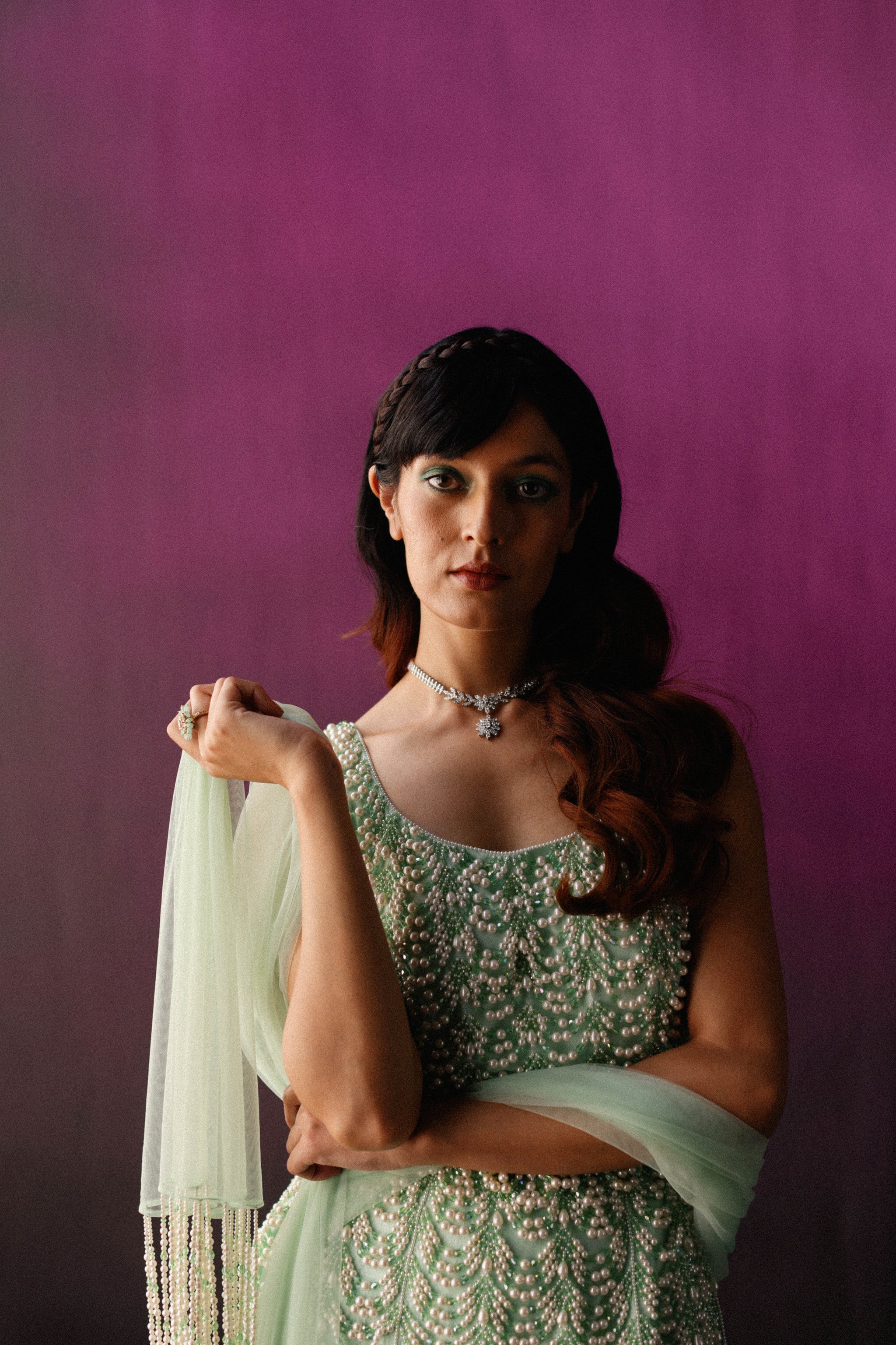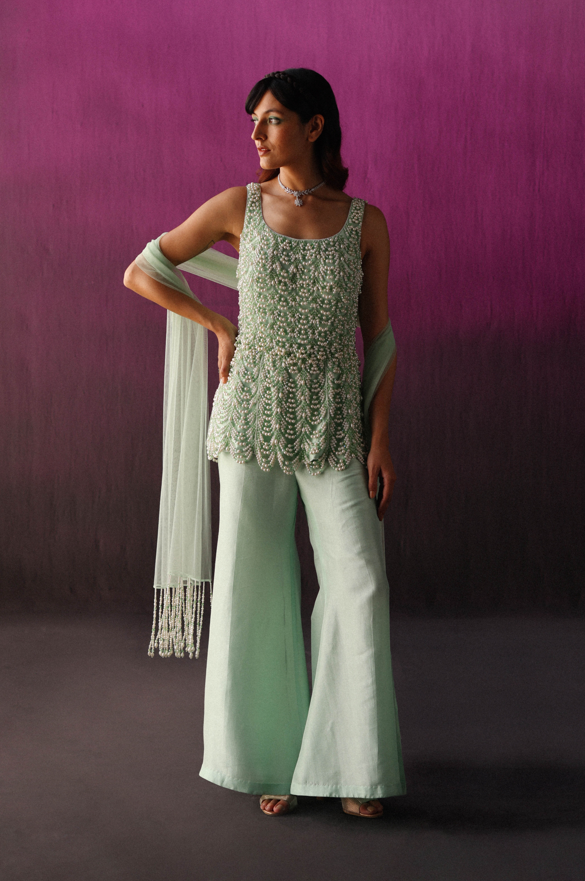 • Short silk shirt encrusted with hours of hand work of glass pearls & crystal, paired with a flowy satin sharara and a net dupatta with pearl detailing.