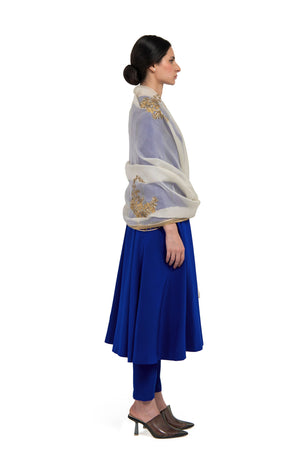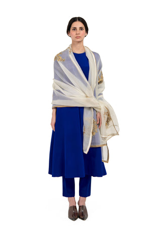 • Suki natural silk organza odhani features zardozi embroidered magnolias in the form of a crescent. It is highlighted with glass beads and sequins.