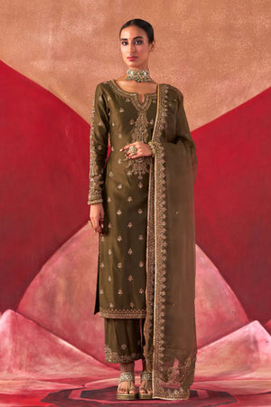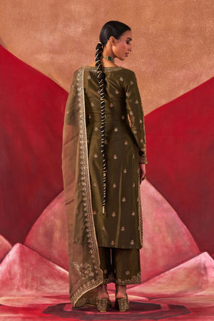 • Featuring an olive chanderi silk kurta set paired with an organza base dupatta with antique gold dori and embellished hand embroidery.