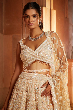 • Nude pink tulle lehenga choli dupatta with belt worked in tonal and ivory sequins beadwork and crystals