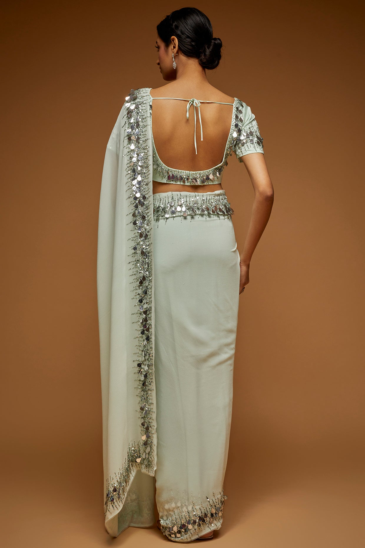 • Onora Ocean blue georgette saree with sequin & cutdana border paired with cap sleeve blouse.