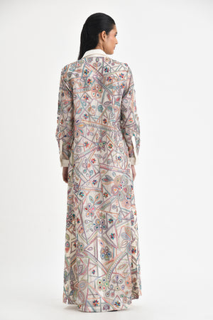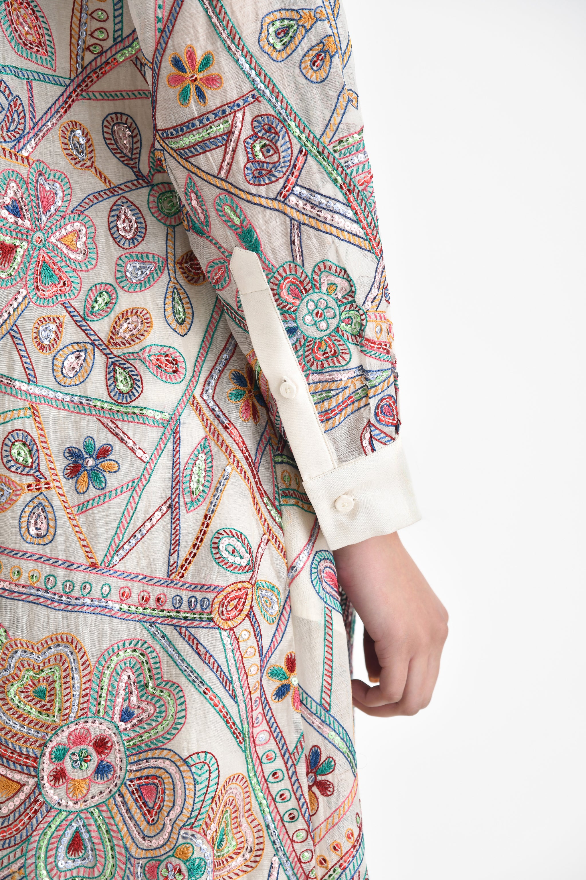 • Hand embroidered front open v- neck full length shirt dress, featuring the abstract interpretation of tradional kedia embroidery. The intricate thread and sequin embroidery gives it a fine and luxurious feel, ideal for a special evening.