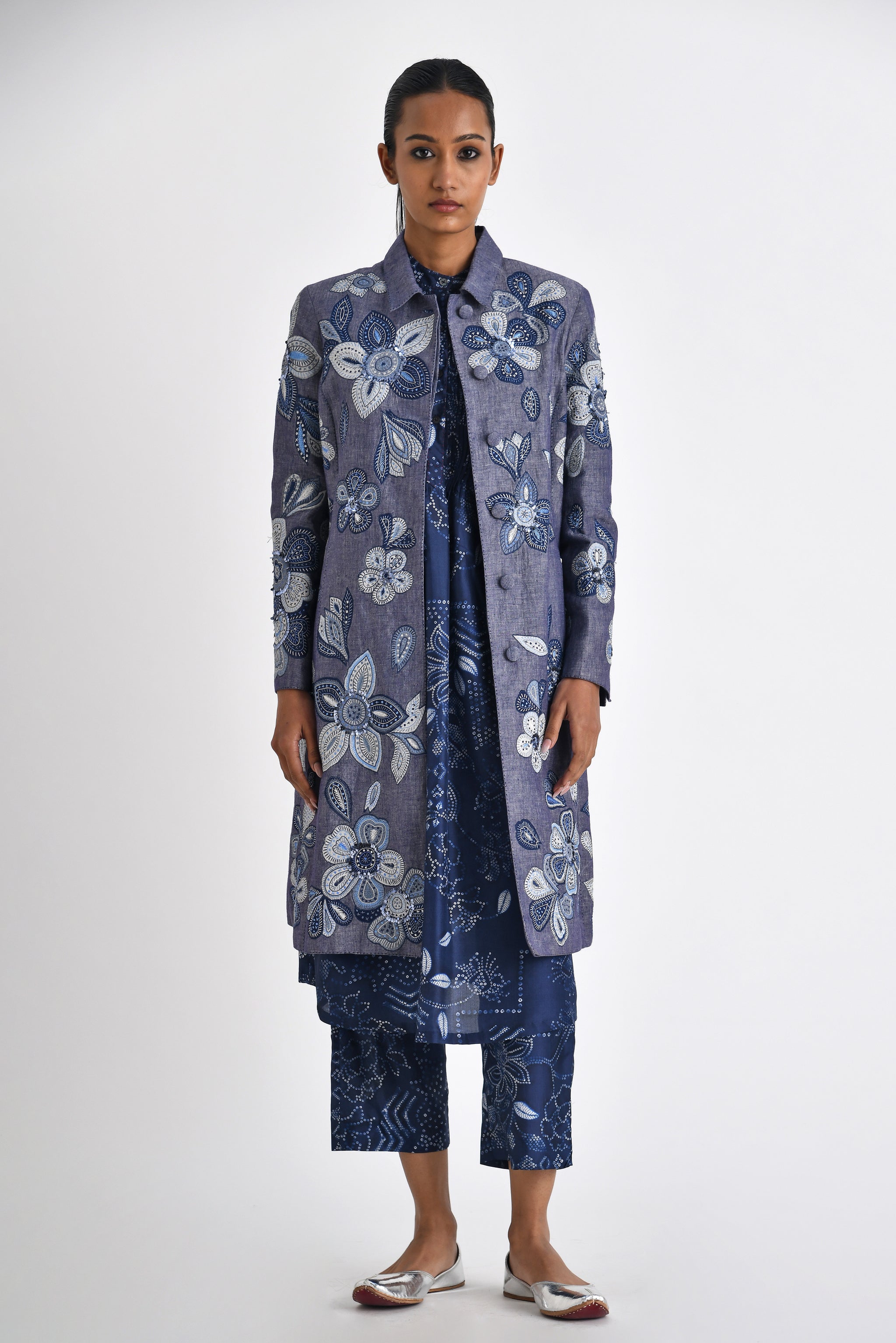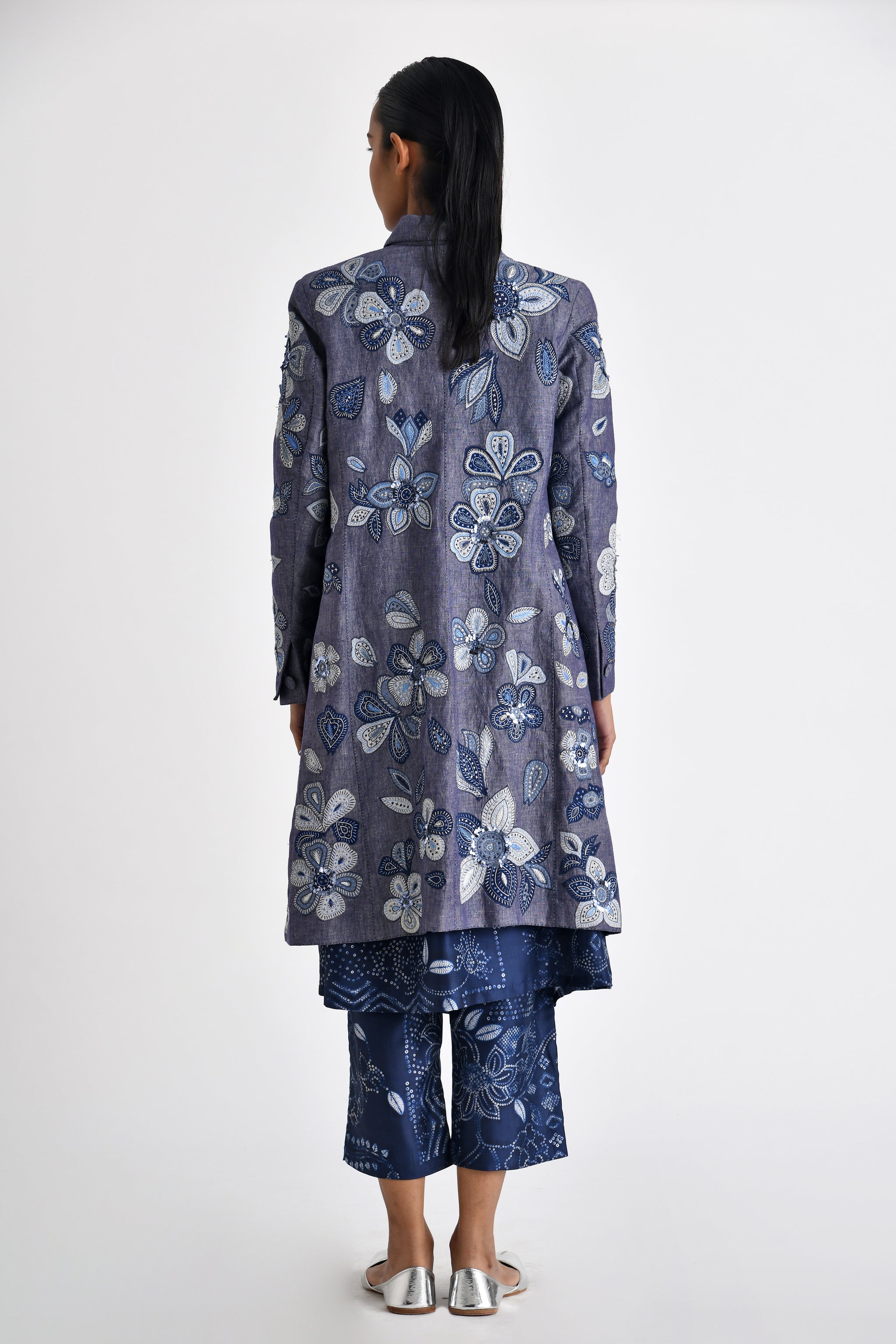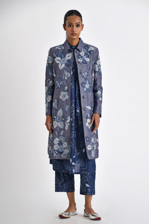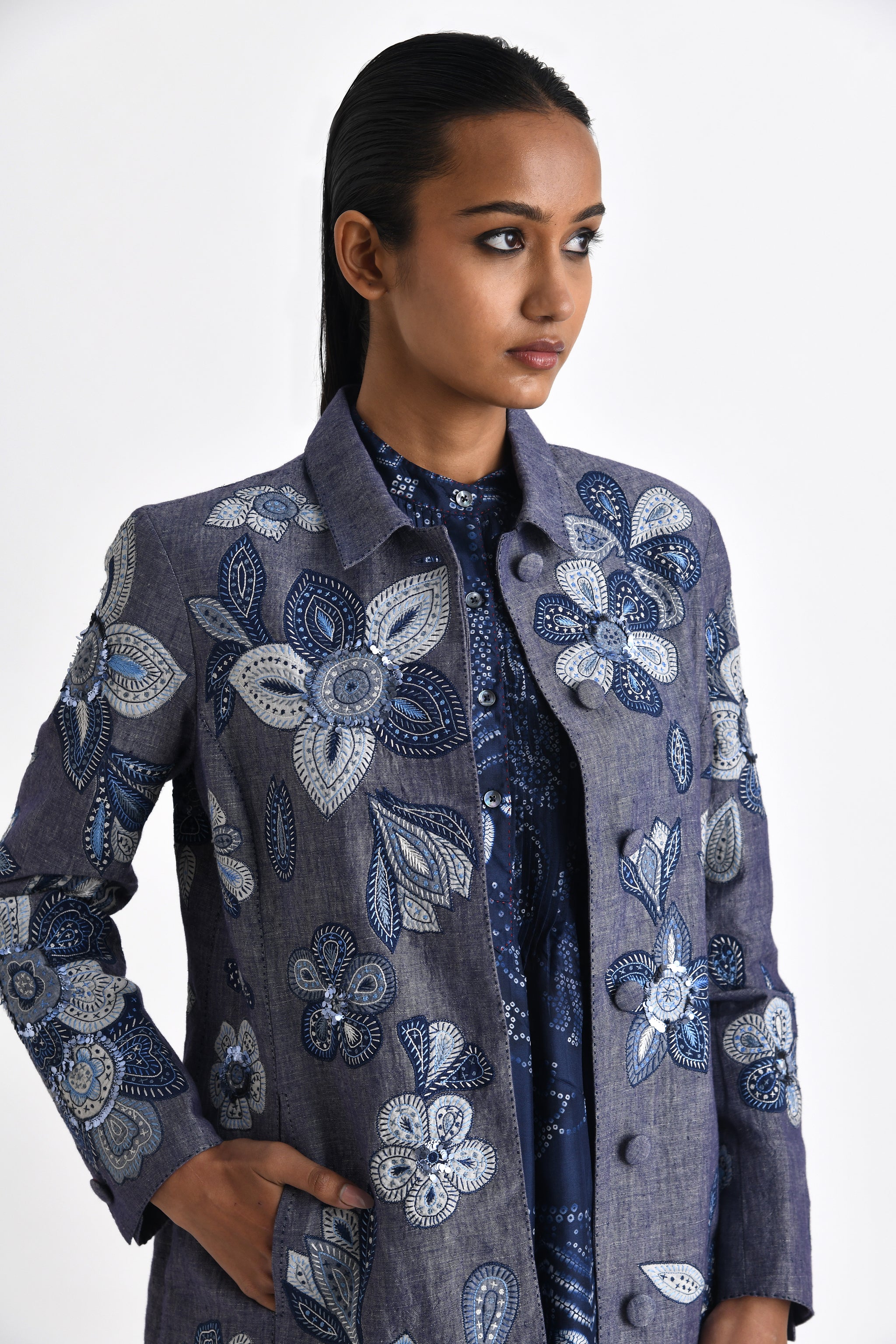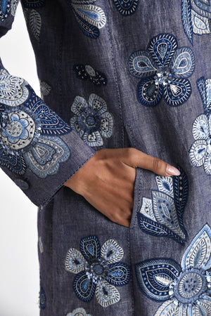 • Collared jacket with floral patchwork motifs embroidered with sequins sprinkled at parts. A dressy evening jacket for the summer.