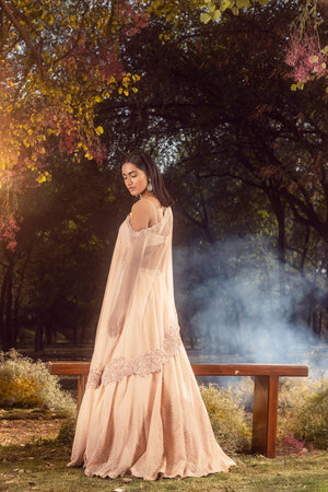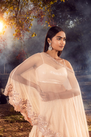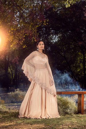 • Self embroidered georgette lehenga and bustier with an assymetrical net cape embroidered in tonal resham , beadwork , sequins and crystals
