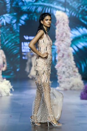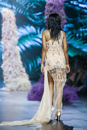• Peach fuzz one sholder hand embriodered asymentrical dress with tail