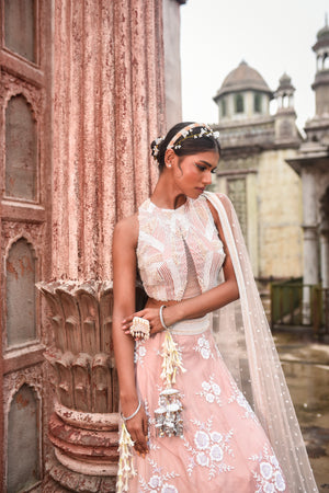 • This lehenga from our series ivory over everything has intricate embroidery from all materials white and off white, paired with a sleeveless peekaboo pattern blouse and the heavily embroidered dupatta to complete the look.