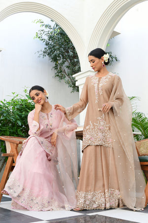 • This 3 pc sharara set comes with intricate resham embroidery with dual color applique florals highlighted with sequins and pearls and organza 3d rosettes on the front and back hemline of the kurta as well as on the neck and sleeves, adorned with a delicate rosette lace running along the slit hemline and sleeves. The sharara comes with the same broad embroidered border with a delicate rosette lace under the border. The set includes an embroidered cutwork odhni.