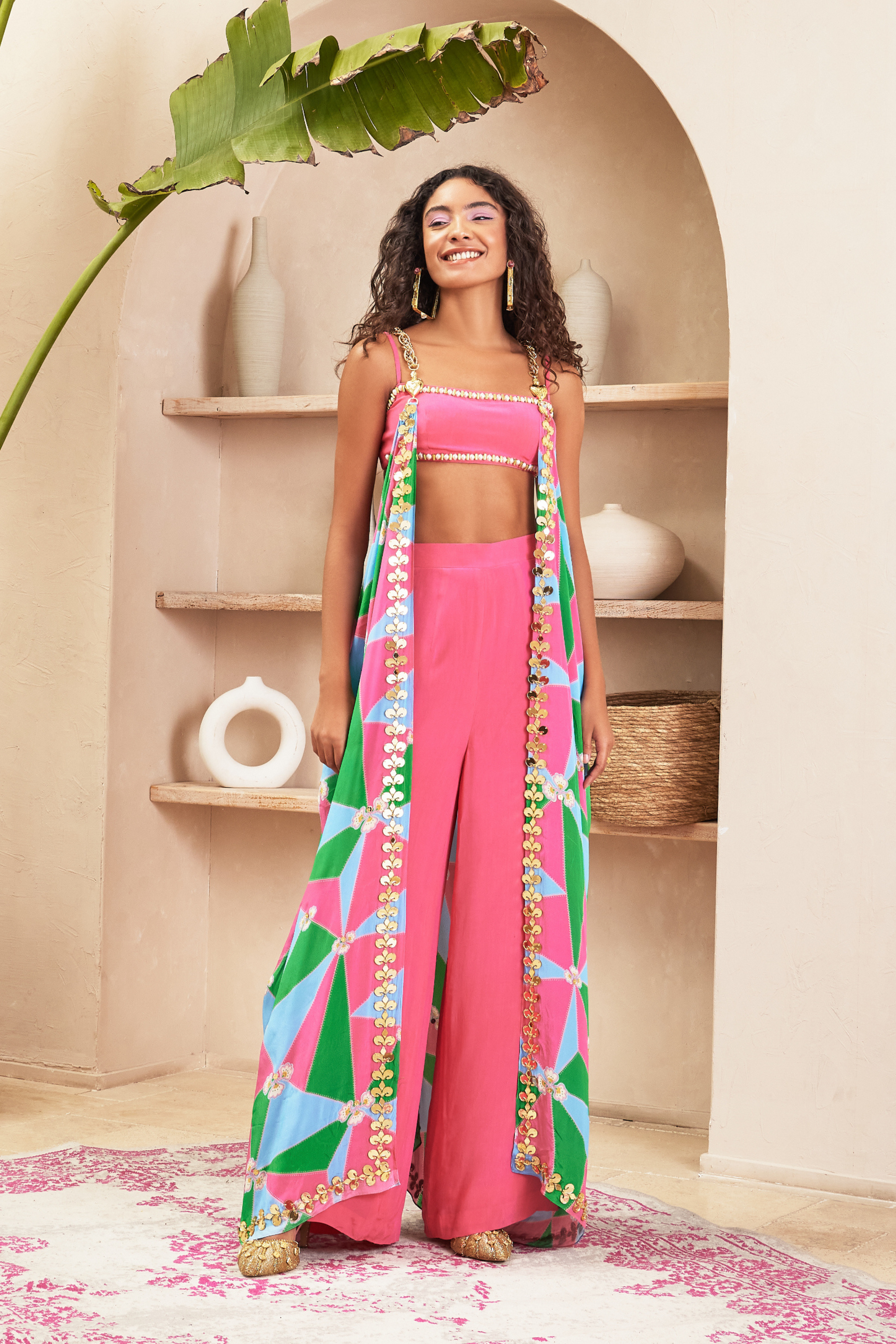 Pink Pant & Bustier With Multi Colour Jacket Set