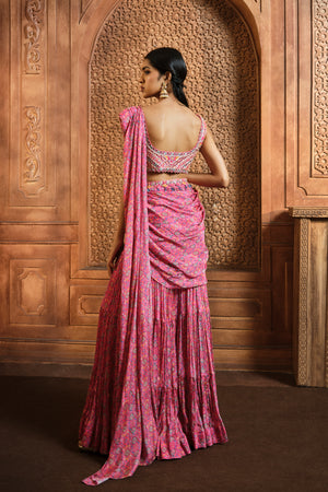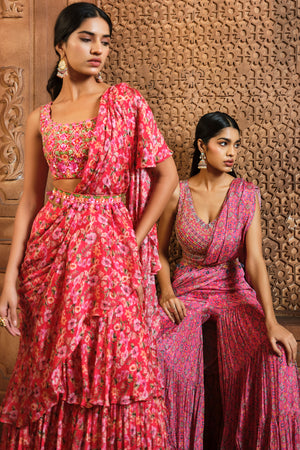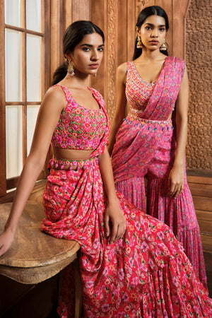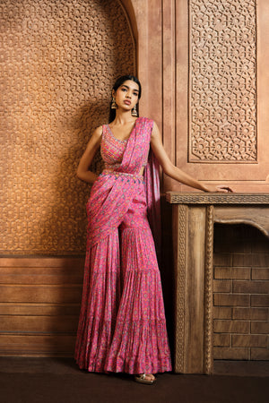 • Featuring a pink persian chiffon printed gathering sharara with attached pallu and a linear pattern hand embroided sleeveless blouse.