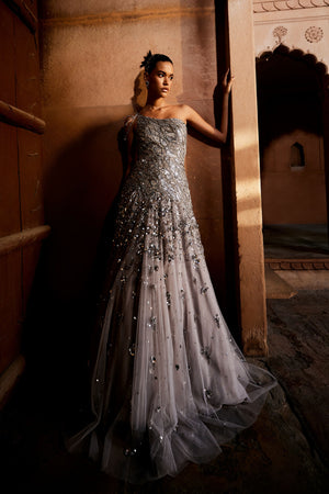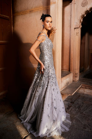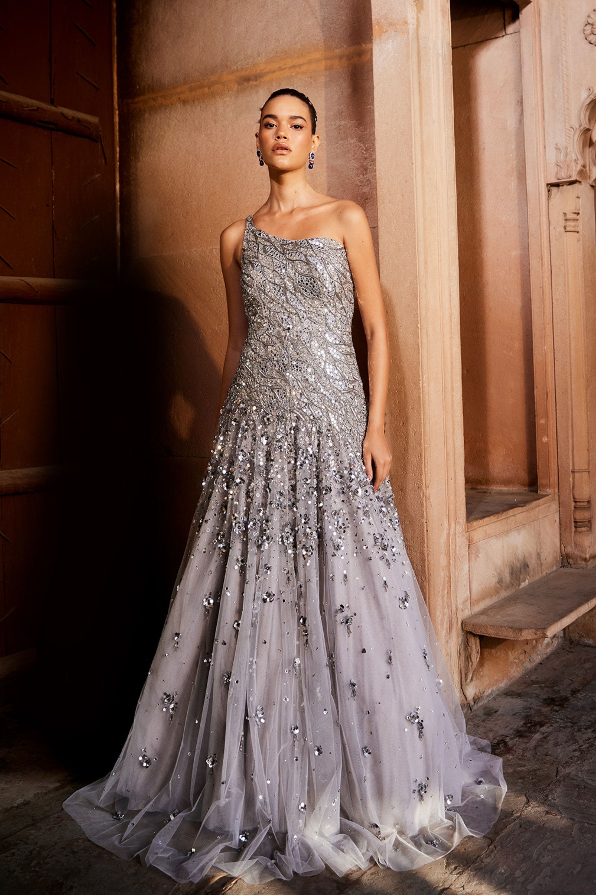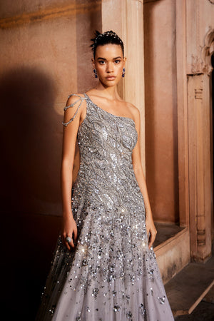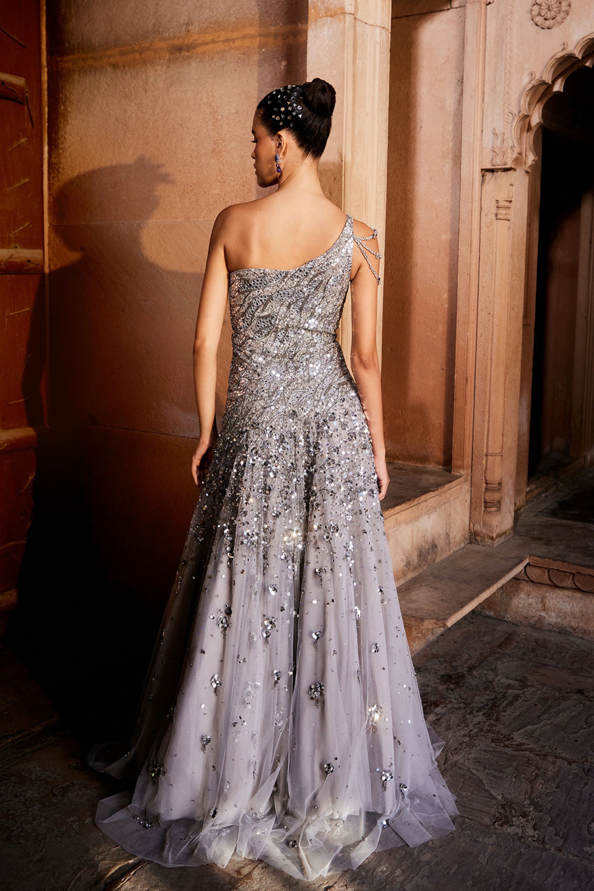 • One shoulder grey net gown with a meandering shaped embroidery pattern using zardosi, cutbeads and patra, a matching crystal shoulder broch.