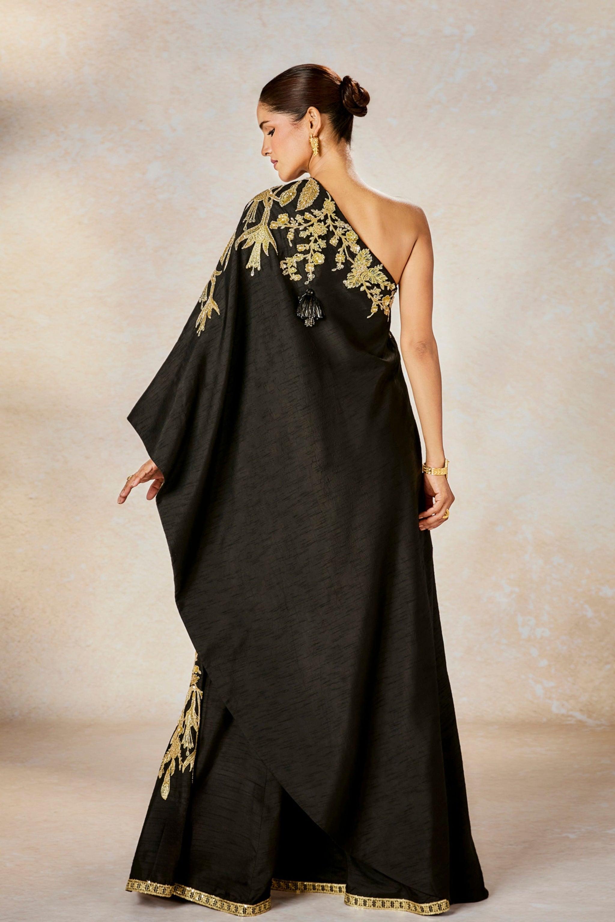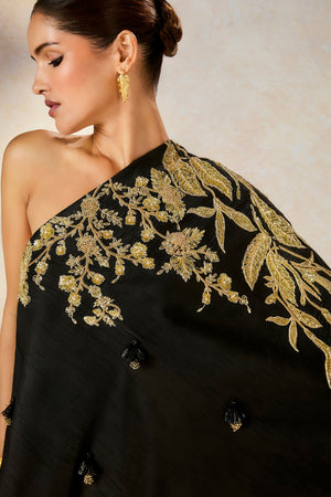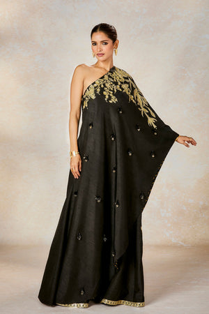 • Introducing the raat rani one shoulder set, a fusion outfit that blends traditional artistry with contemporary style. This captivating ensemble features a one shoulder top, richly embroidered with zardosi and moti work, reflecting the opulence of indian craftsmanship. It is adorned motifs like the 'kusum kali', symbolizing grace and natural beauty, making this piece truly one-of-a-kind. The ensemble is completed with an embroidered sharara. The raat rani one shoulder set is perfect for those who seek to make a statement with timeless elegance and a touch of whimsy, ideal for weddings, festive occasions, or any event where you wish to stand out with grace and charm.