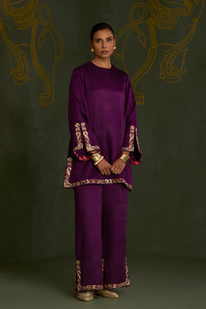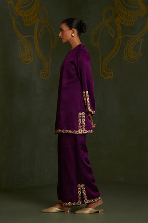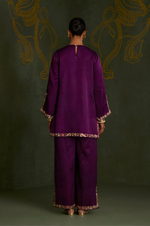 • Crafted in luxurious gajji silk, this elegant purple kurta set is intricately hand embroidered with dabka, naqshi, resham, and sequin detailing. The kurta features slitted sleeves adorned with embroidery, while the flared hemline and matching pants carry embroidered slits that move beautifully with every step.