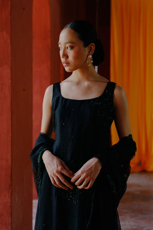 • Elevate your style with our organza kurta, featuring striking black and green embroidery.The intricate patterns and rich colors enhance its elegance, making it a standout piece for any night occasion.