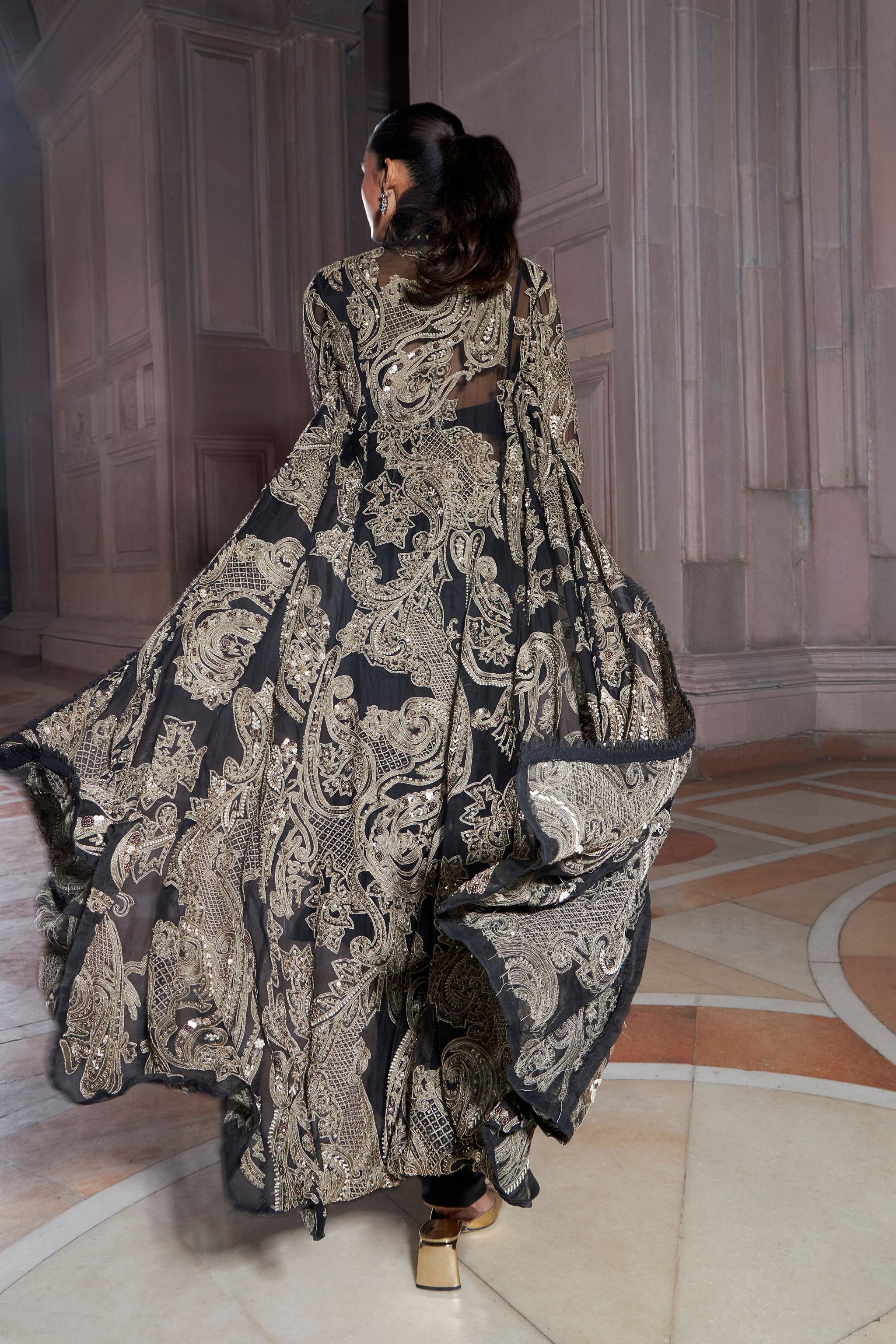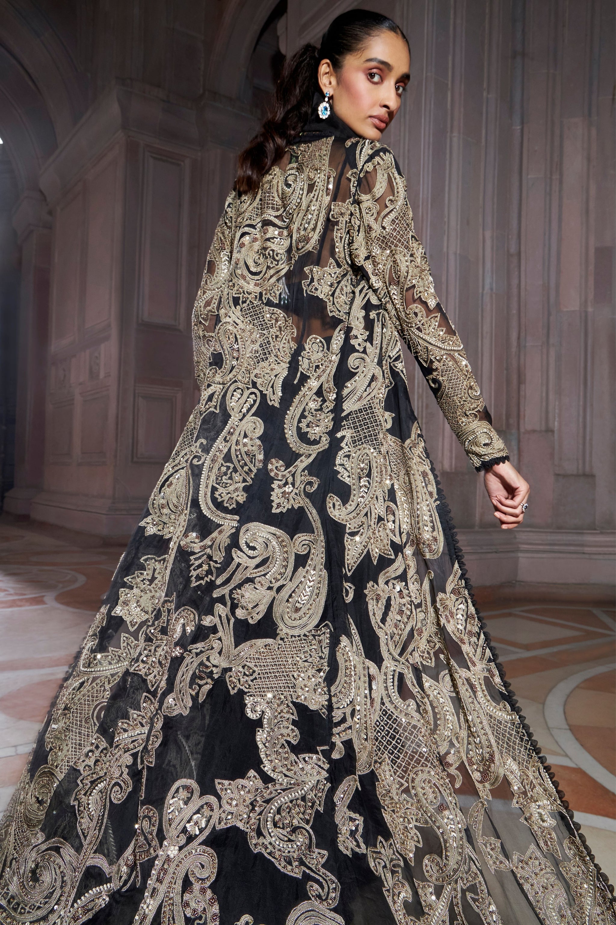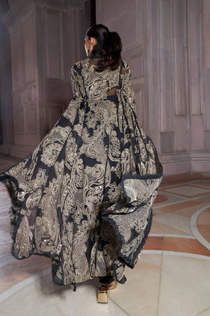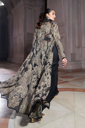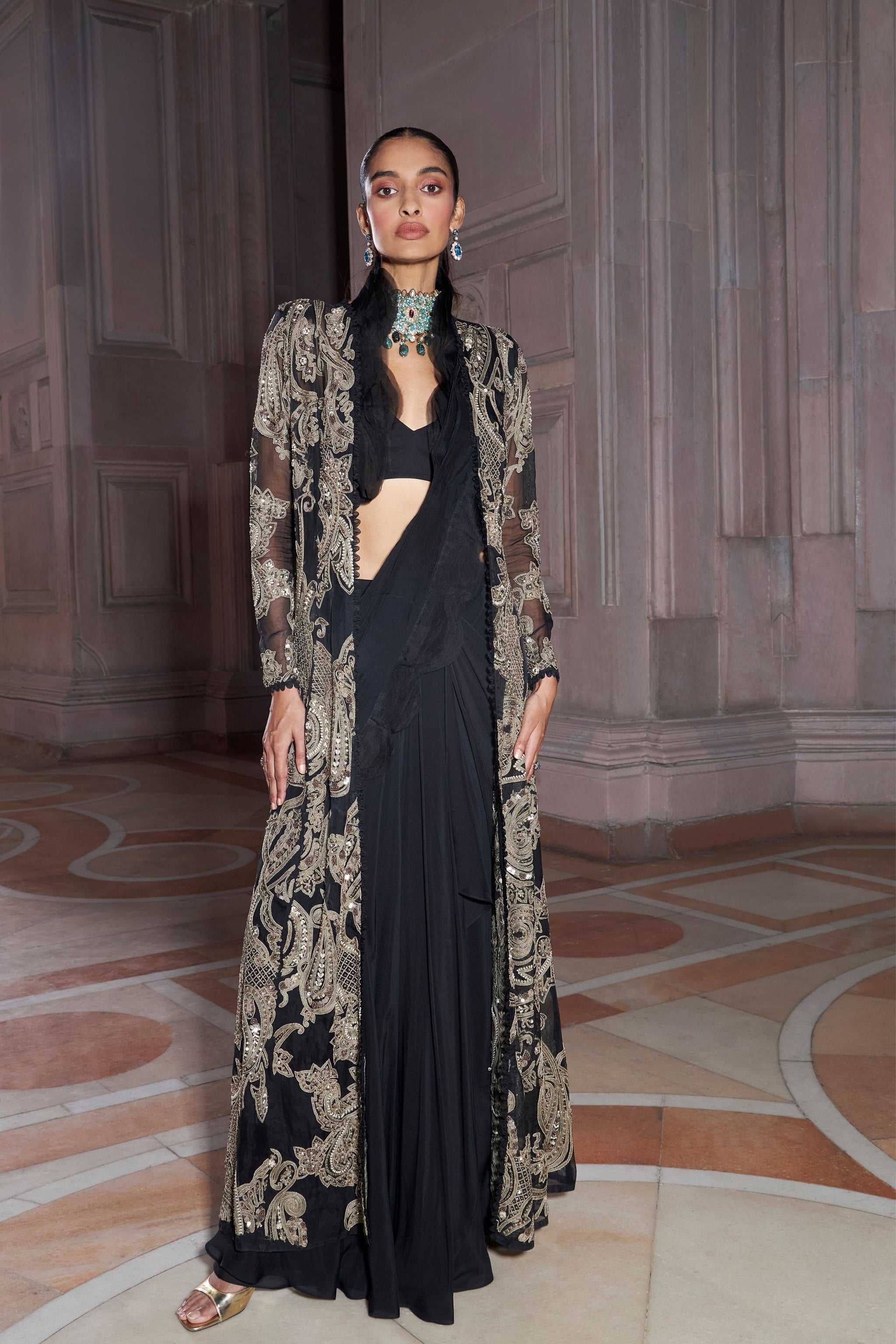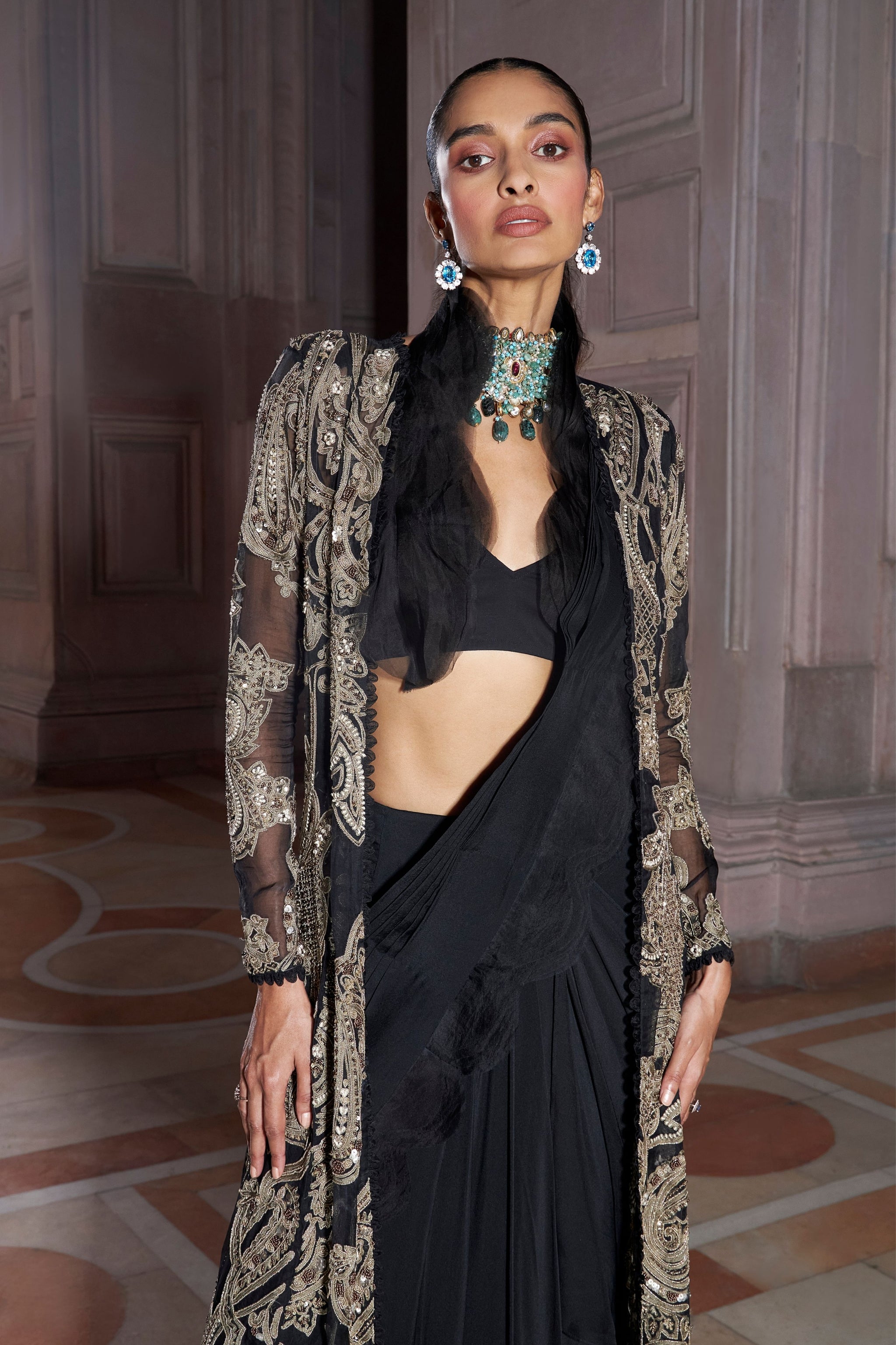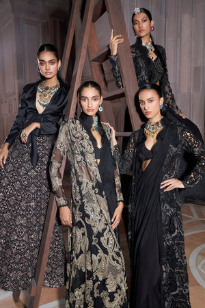 • Exquisitely black crafted jacket with a contrasting colour tone embroidery t with pre-drape saree. The statement ruffle collar detail adds to the beauty of the outfit and makes the ensemble look splendid.
