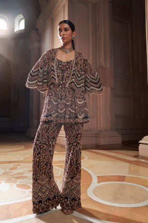 • Black heavily embellished cape handcrafted with beautifully intricate motifs, and sparkle pearl embellished details, artfully paired with crafted pants and peplum.