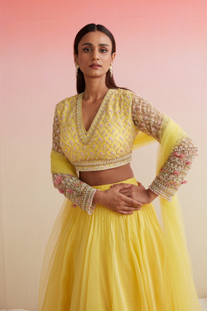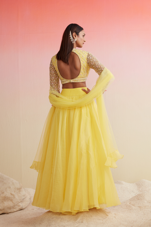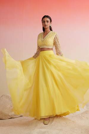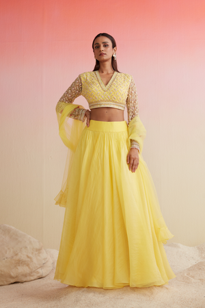 • Yellow Net full sleeves embroidered blouse paired with plain organza skirt and net dupatta with organza frill