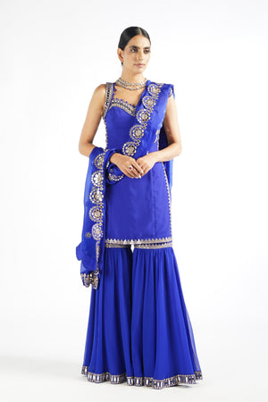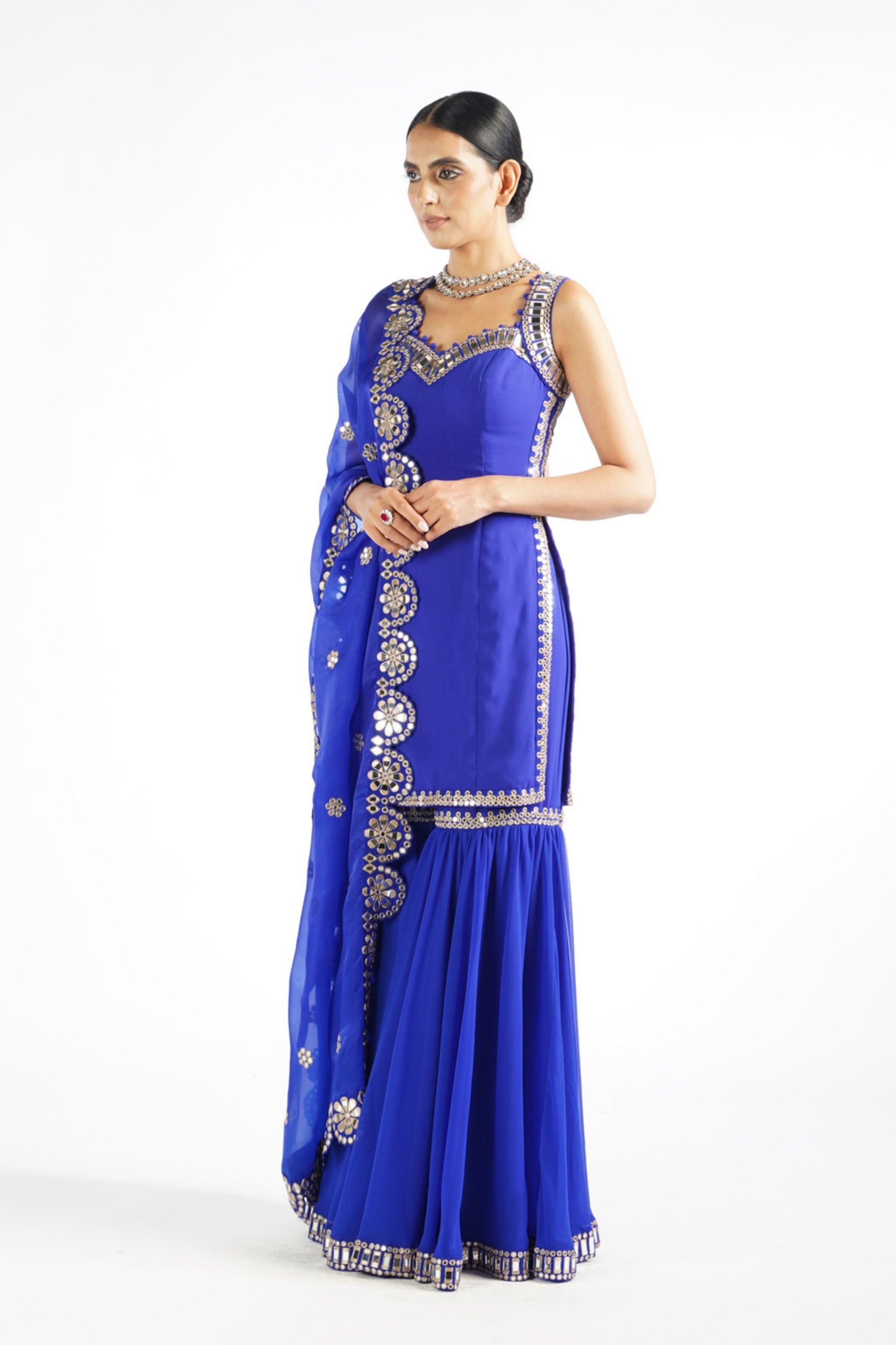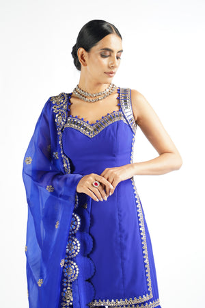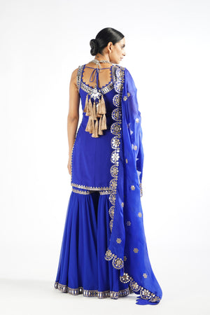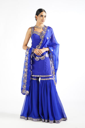 • Royal blue georgette sharara with real hand cut mirror embroidered kurta and satin organza dupatta.