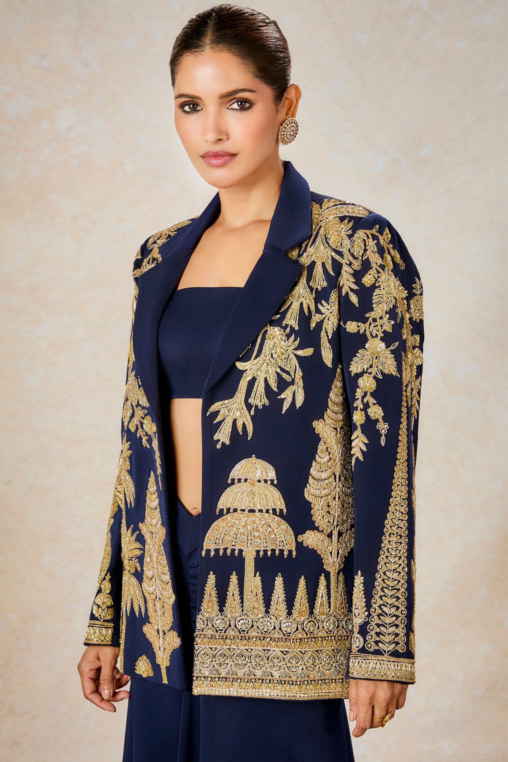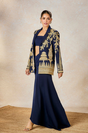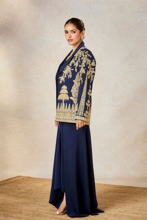 • The sanjh bagh blazer set, a fusion outfit that blends traditional artistry with contemporary style. This captivating ensemble features a blazer, richly embroidered with zardozi, moti work, reflecting the opulence of indian craftsmanship. The blazer is adorned with enchanting motifs like the 'kusum kali', 'son chaya' and 'sehra', symbolizing grace and natural beauty, making this piece truly one-of-a-kind.The ensemble is completed with a draped skirt, with a drape detail that adds a modern flair to the traditional silhouette. The sanjh bagh blazer set is perfect for those who seek to make a statement with timeless elegance and a touch of whimsy, ideal for weddings, festive occasions, or any event where you wish to stand out with grace and charm.